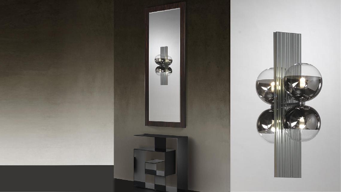 Wall lamp with support in smoked mirror glass or with London engravings. Equipped with 2 'light filter' spheres diam. 16 cm in bronze, copper or silver finish with  LED