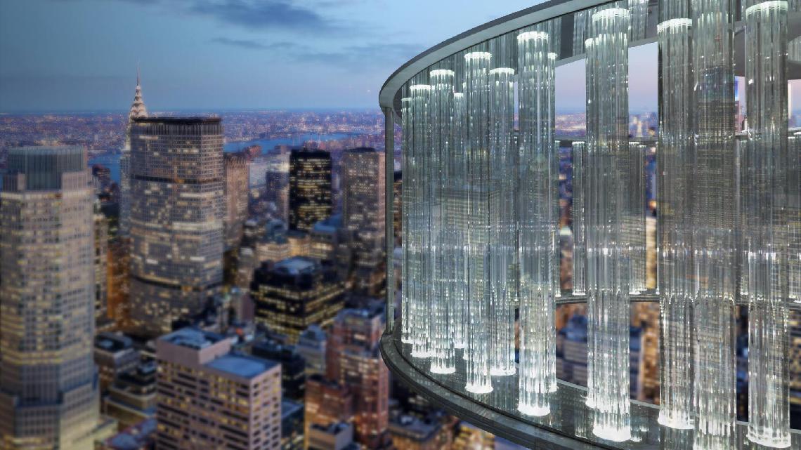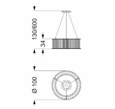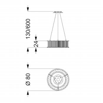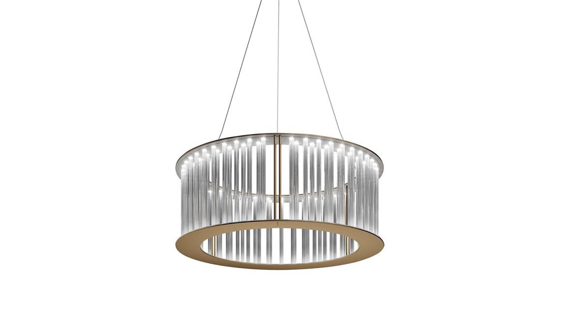 Suspension lamp with metal structure in satin brass or titanium finish and solid transparent glass elements. Ceiling support in mirror glass and Led system.