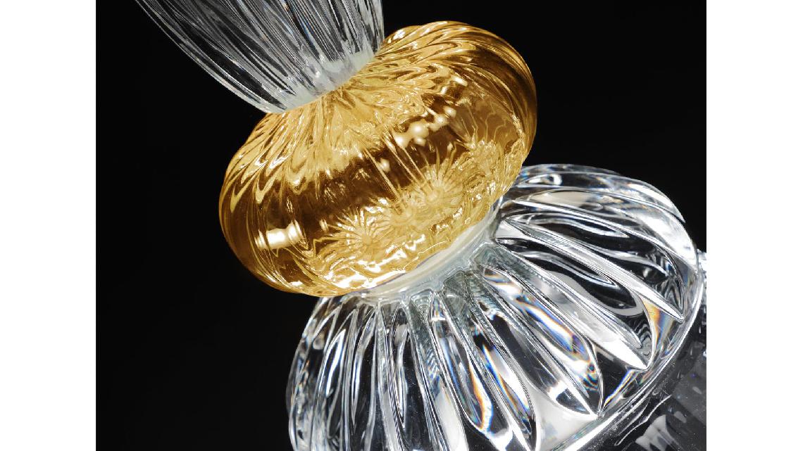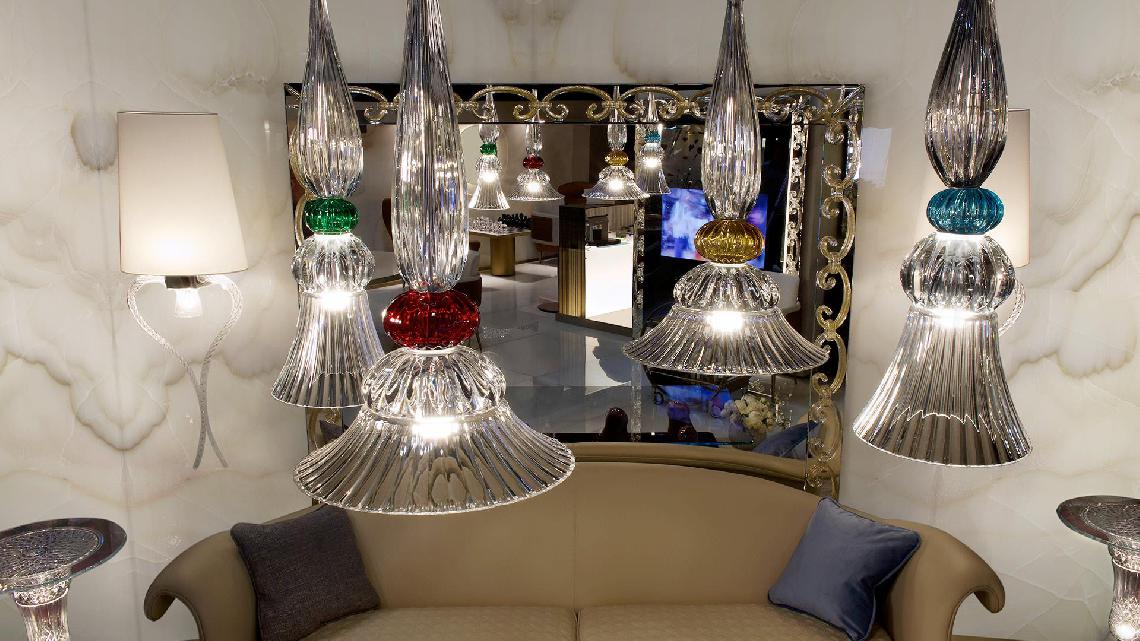 Suspension lamps composed by elements in engraved transparent crystal with coloured detail in amber, red, blue, green or acquamarine.