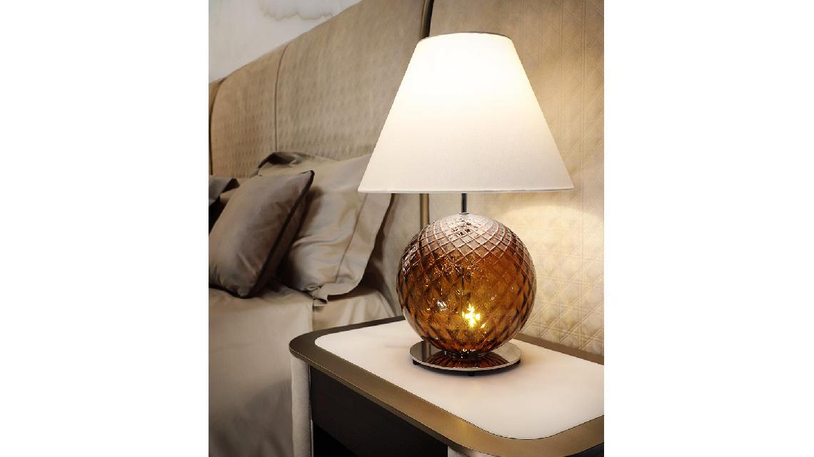 Table lamp in Murano glass transparent or amber colour on shiny steel base. Lampshade in ivory fabric. LED lighting system