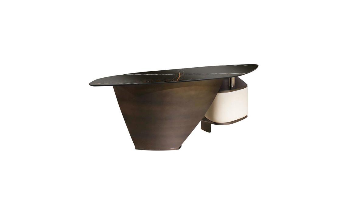 Desk with metal base in Bronze, Brass, Dark brass, Titanium finish. Shaped top in Marble glass 12+4mm th. with cable-hole.