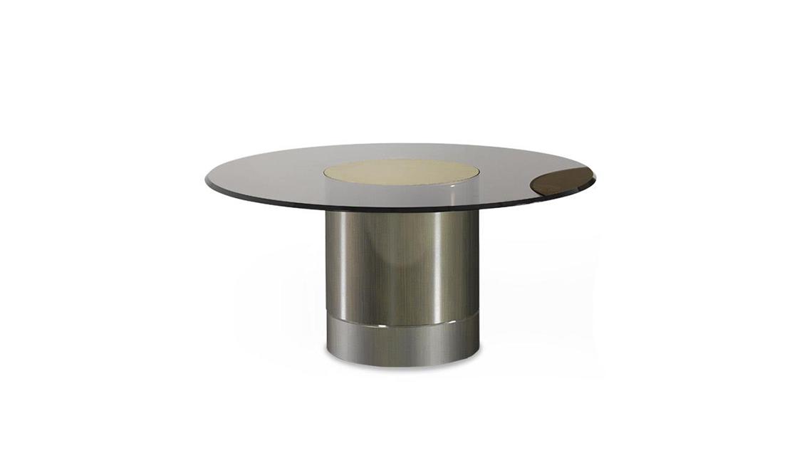 Collection of low and side table with cylinder base painted in shiny dark brass finish with a bottom section in satin matt brass. Junction plate in shiny steel. Top in 10mm thick bronze glass with 45° bevel, placed at the centre or cantilevered.