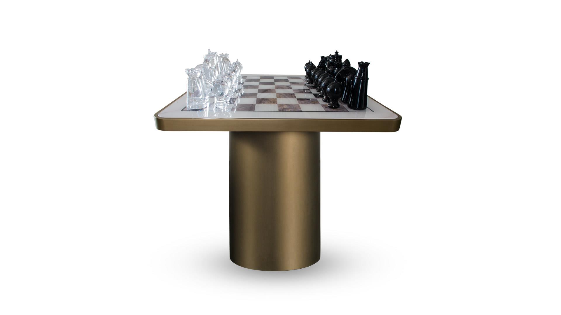 Side table with cylinder base in satin finish: brass, dark brass, titanium, dark titanium. Wooden top 40mm thick in same finish as the base and inlay in Marble glass with chessboard design.