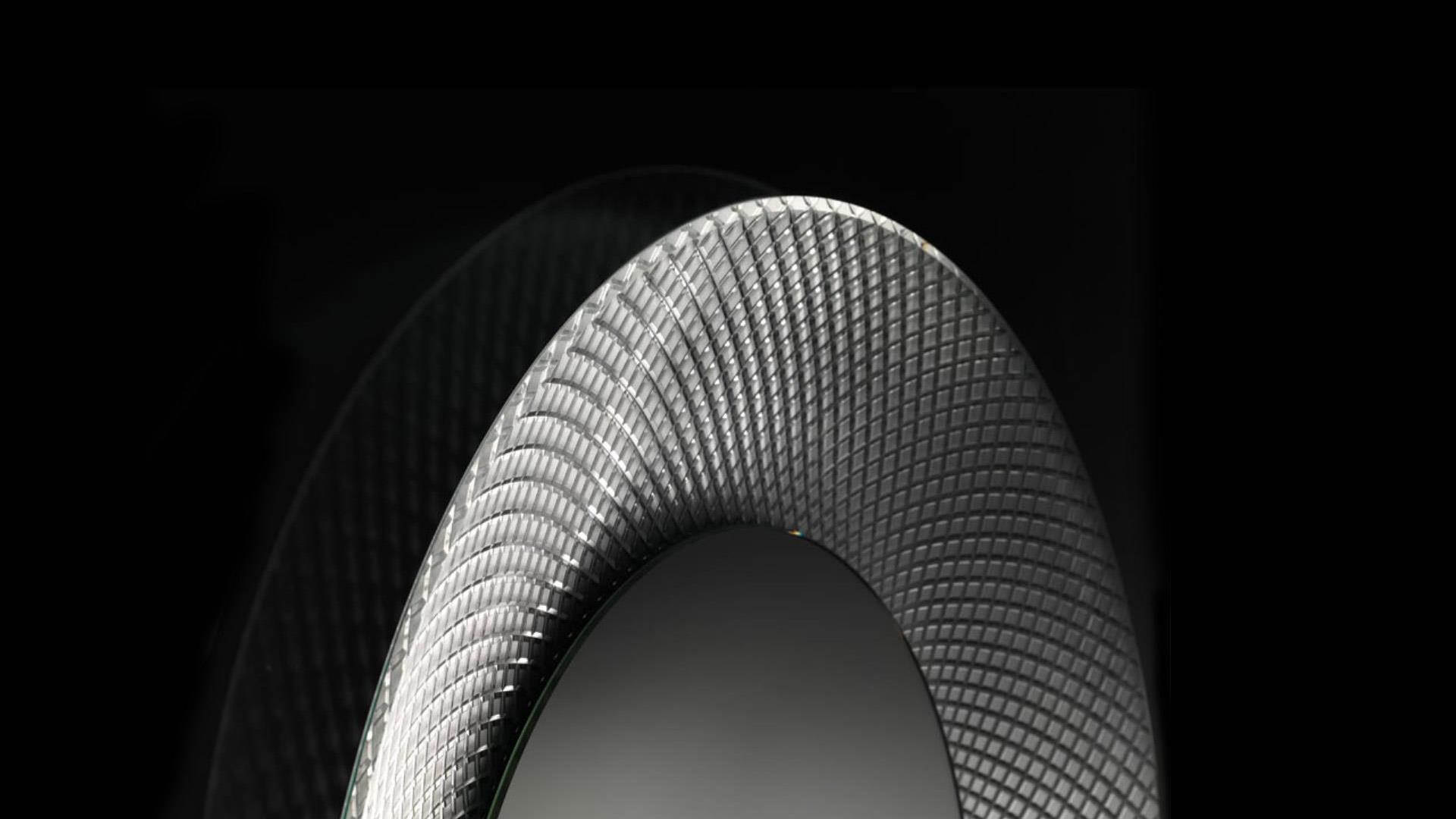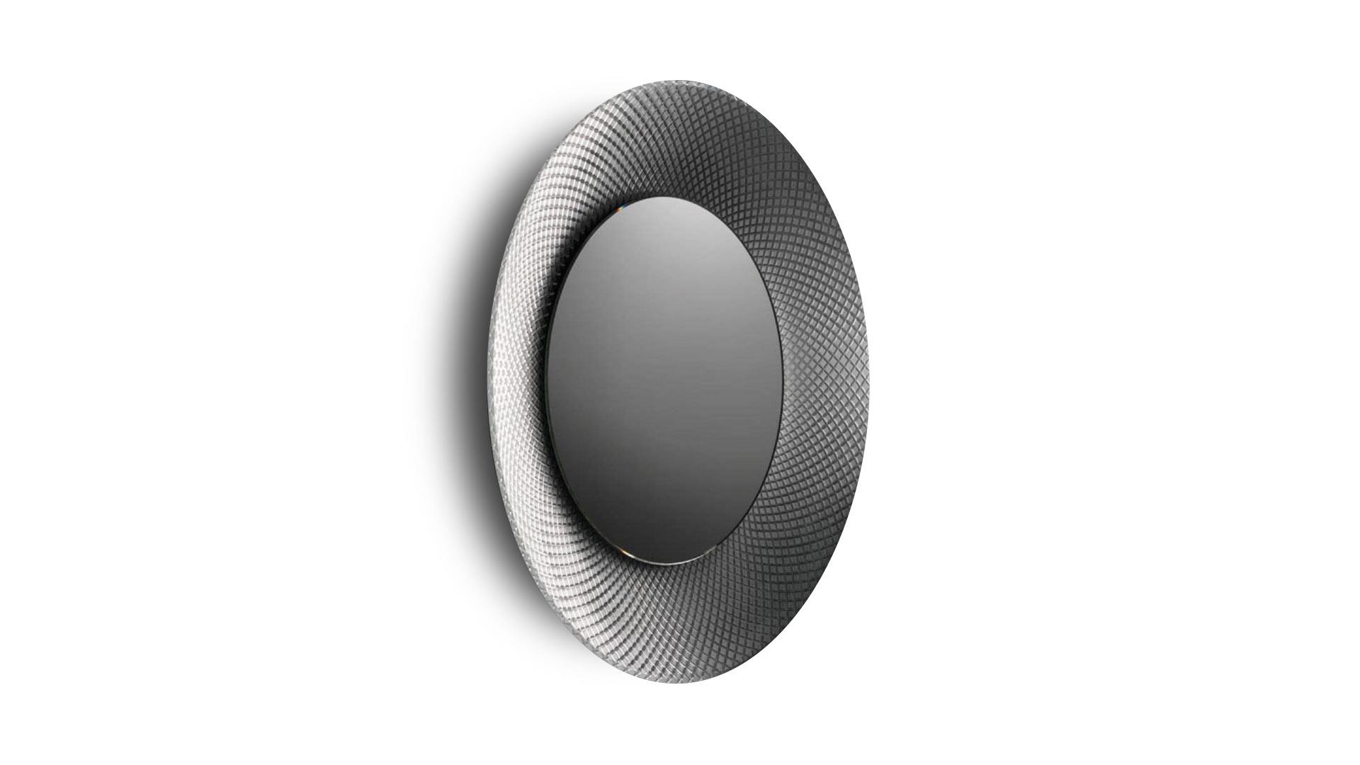 Mirror in 8mm thick extra clear glass with bevel. Curved frame in extra clear etched glass with engravings. LED light between mirror and frame.