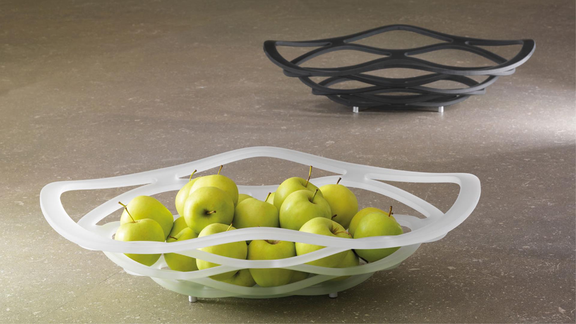 Fruit-bowl in curved extraclear, bronze or smoke-grey glass with etched finish.