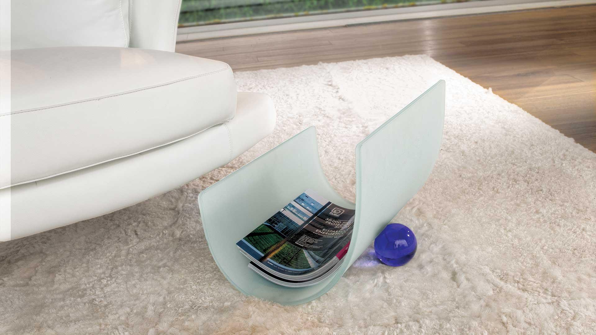 Magazine rack in curved natural sandblasted or extraclear white sandblasted glass 10 mm thick.