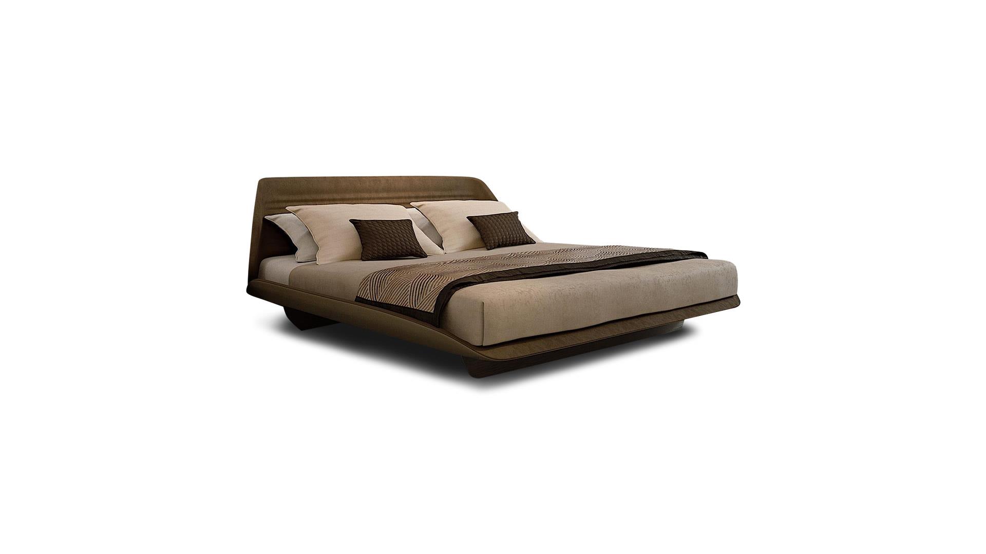 Bed with shaped and padded headboard and bed frame upholstered in fabric or in leather.