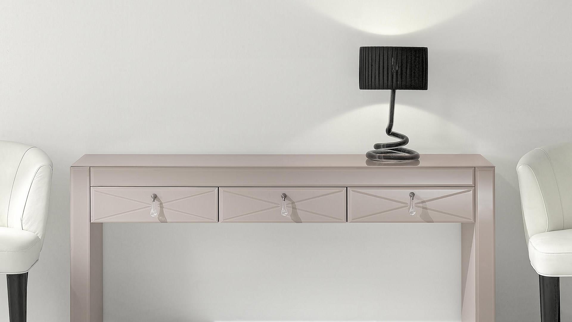 Table lamp in ribbed Murano glass available in transparent, black, tea, ametyst, white coated, ruby-red or gold colour. Lampshade in ivory pongé fabric. Led bulb.