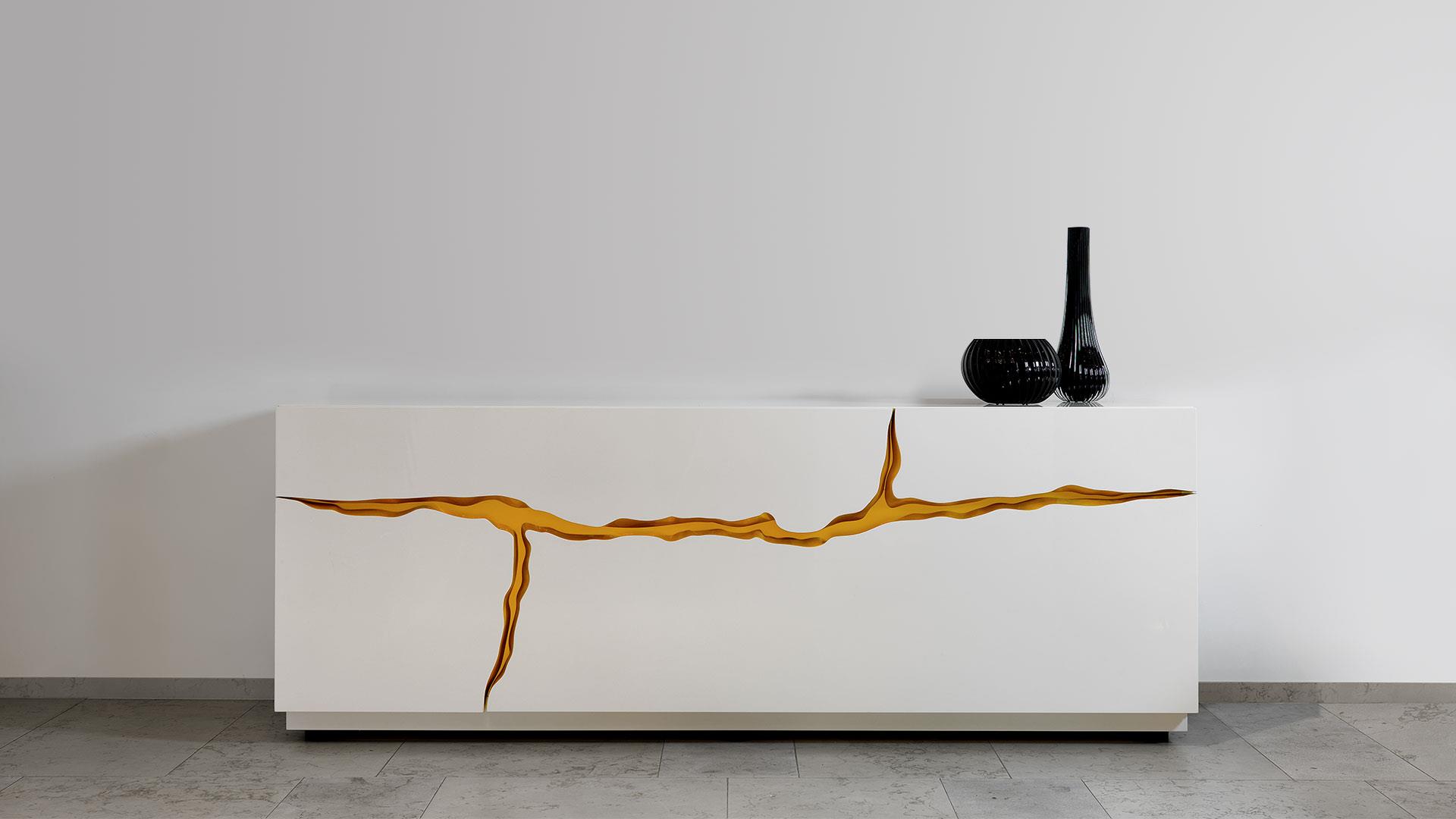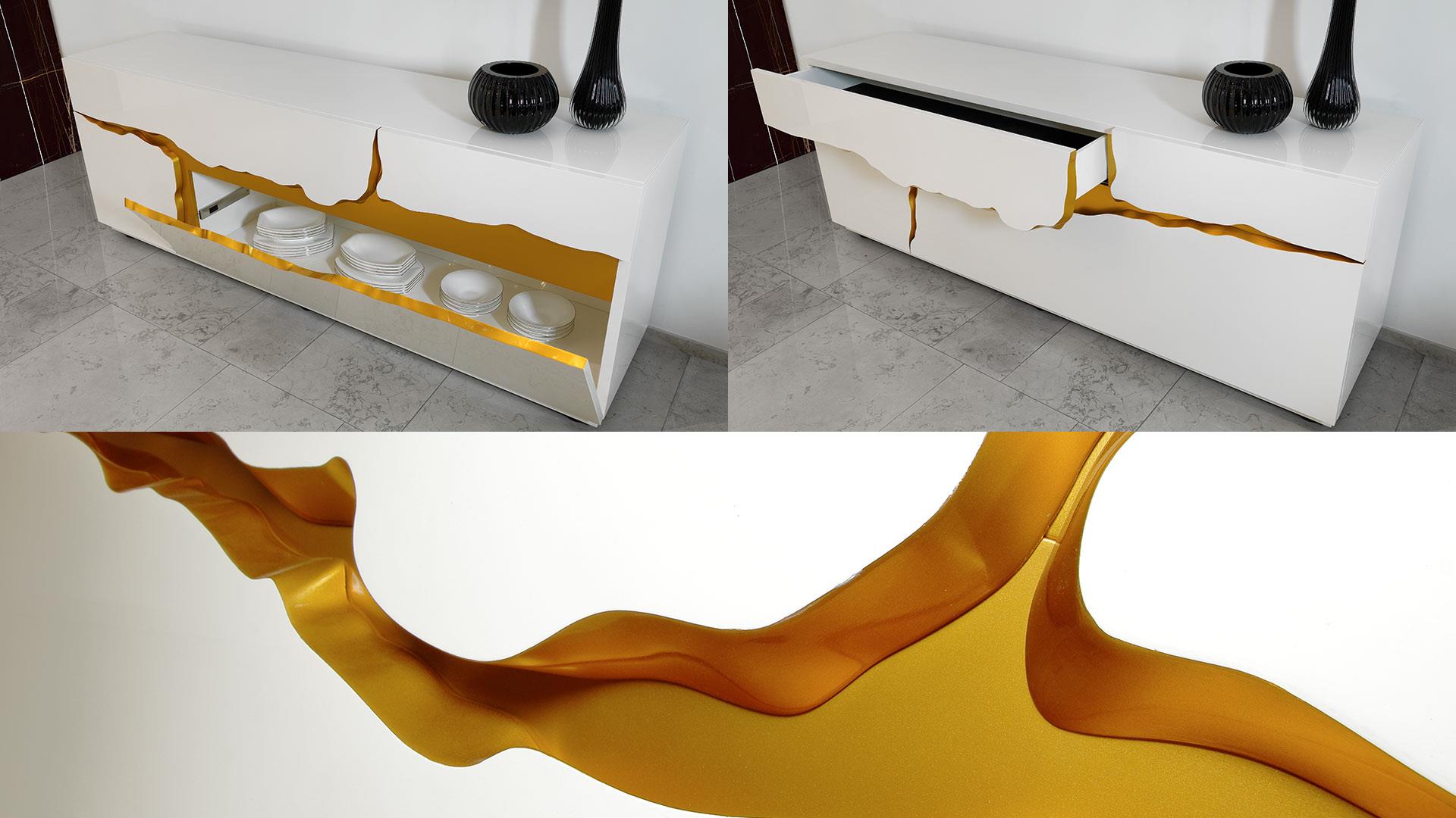 Wooden sideboard in shiny lacquered finish latte or nero beluga colour. Equipped with two drawers, one door and one folding door with decoration in gold finish.