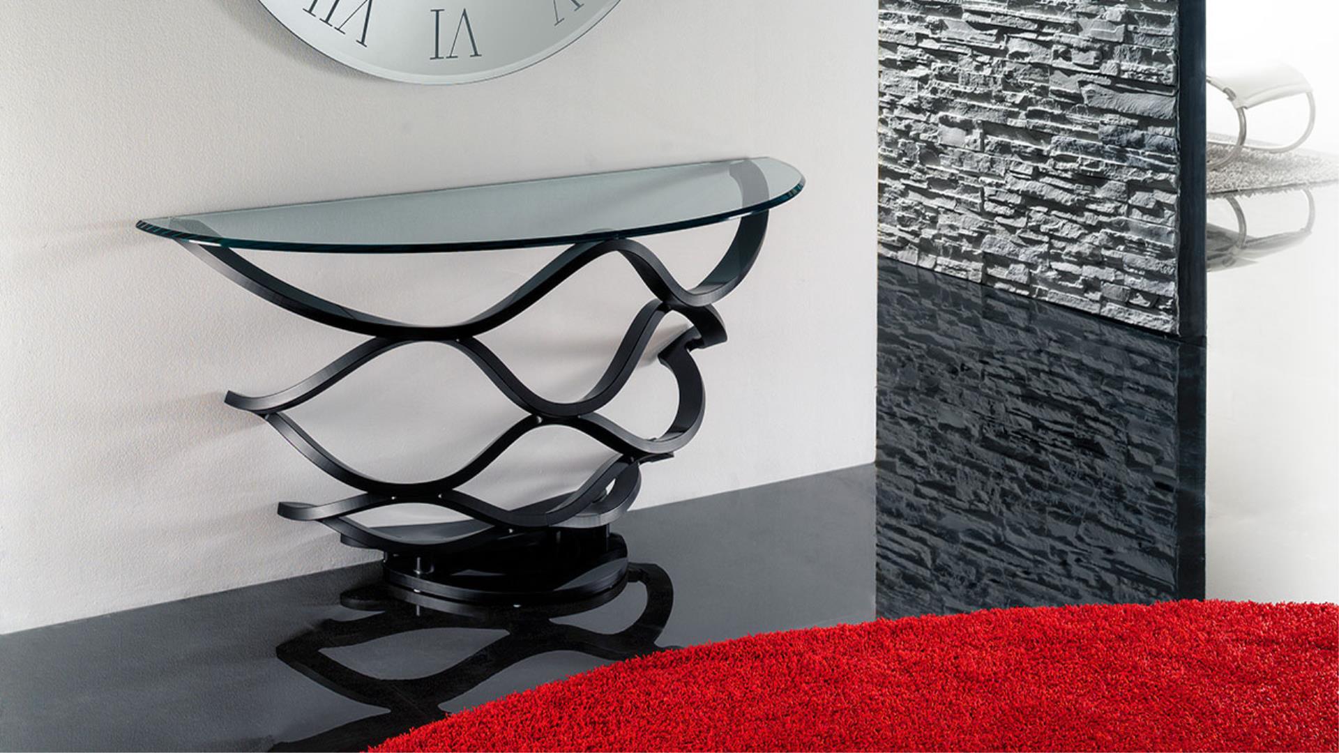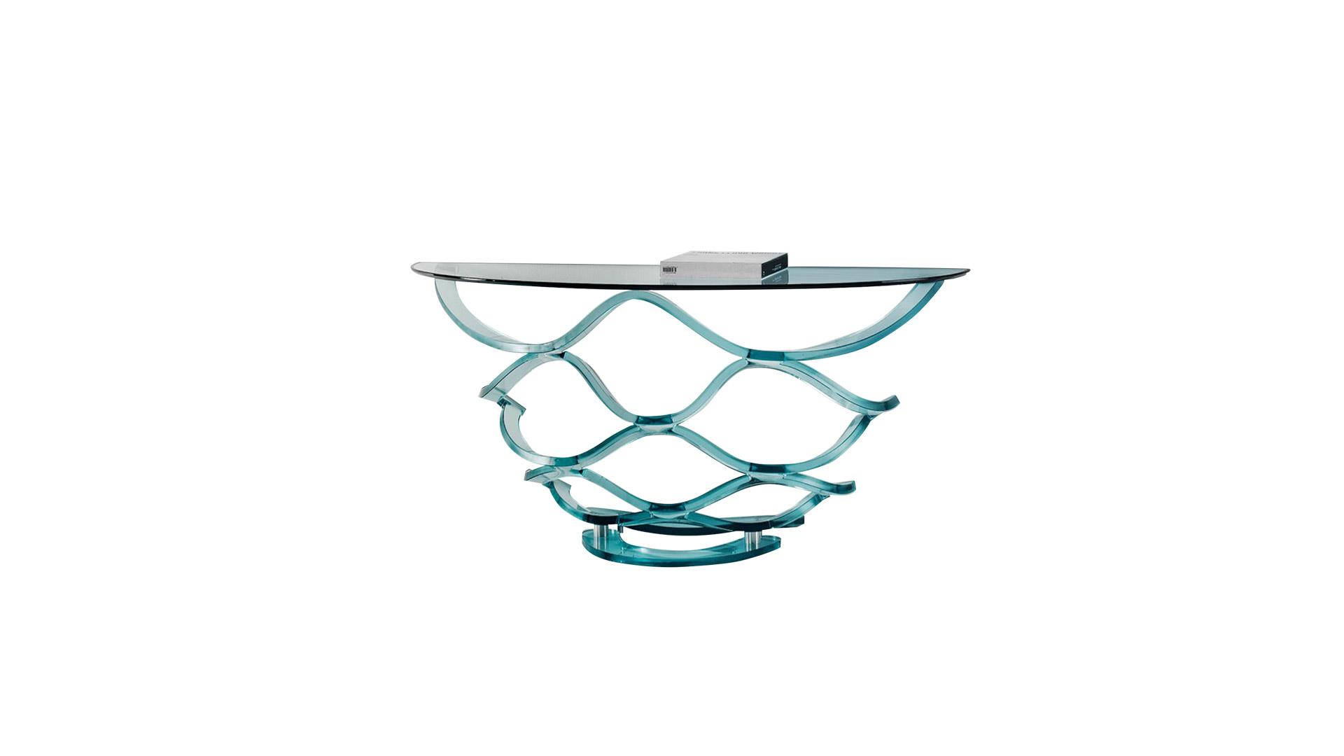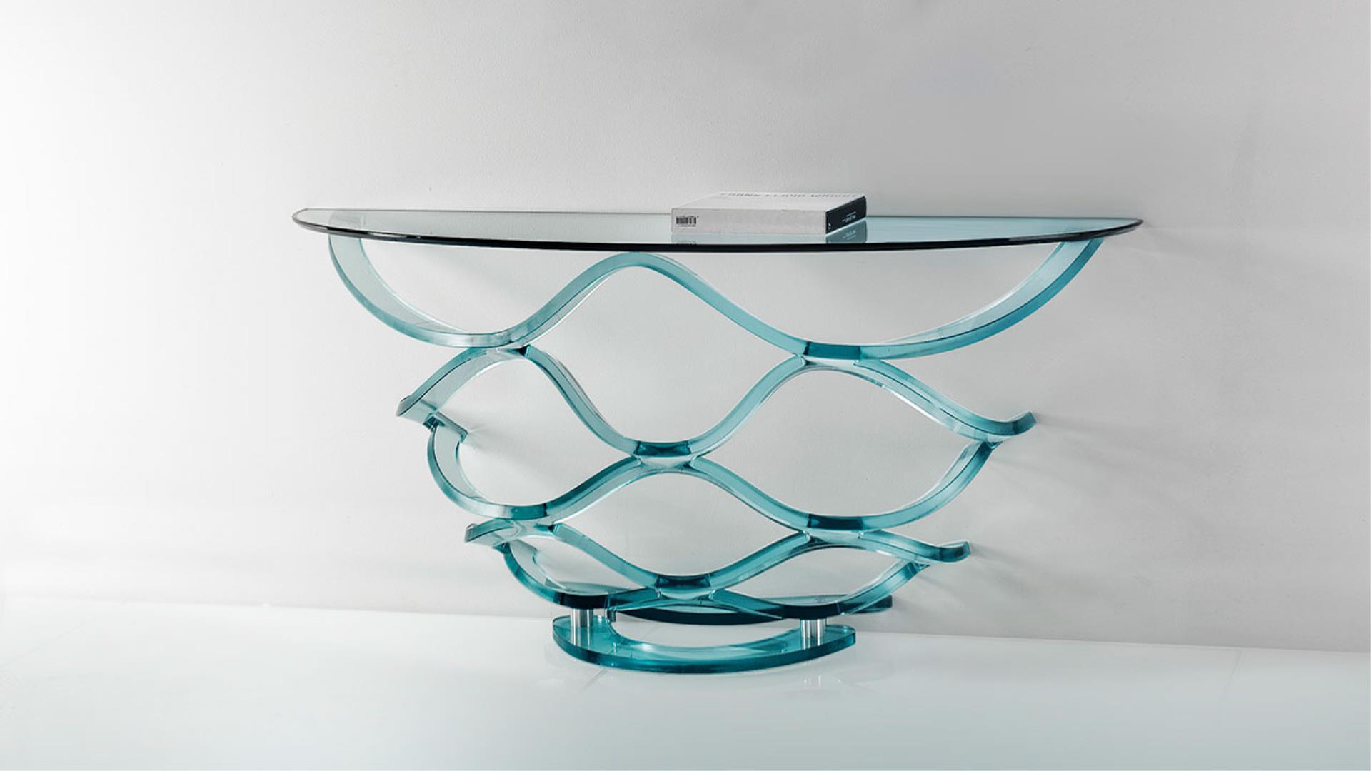 Console in curved 24 mm thick glass, transparent or black lacquered. Glass top 15 mm thick with 45° bevel.