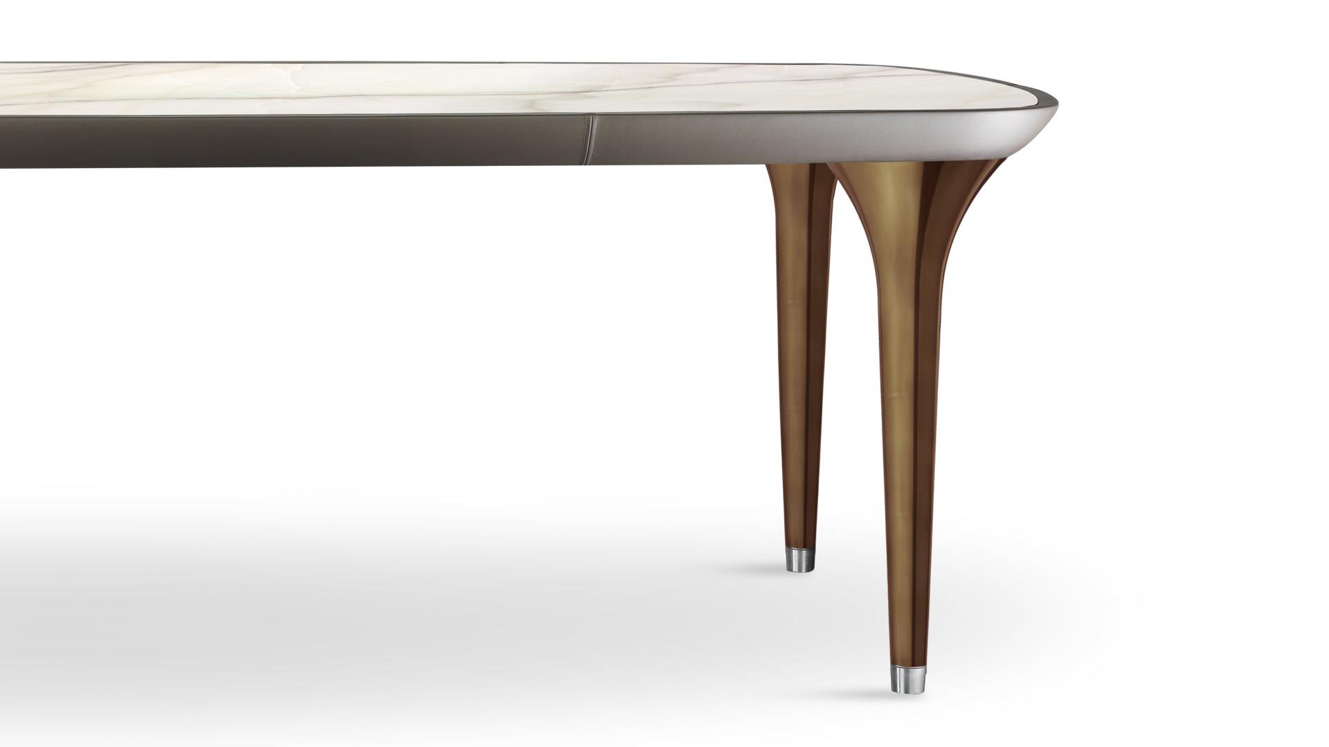 Dining table with 80mm thick wooden top with edges covered in leather. Top cover available in Canaletto walnut, shiny ebony wood, etched lacquered glass, Mesh glass, Marble-glass or in marble. Available also in round version with 40mm thick wooden top with shiny steel details in Canaletto walnut, shiny Ebony wood;or in shiny lacquered finish and a built-in Lazy Susan in etched lacquered glass, Mesh glass, Marble glass or in marble. Legs in black or pearl-grey Murano glass with glazed metal feet.