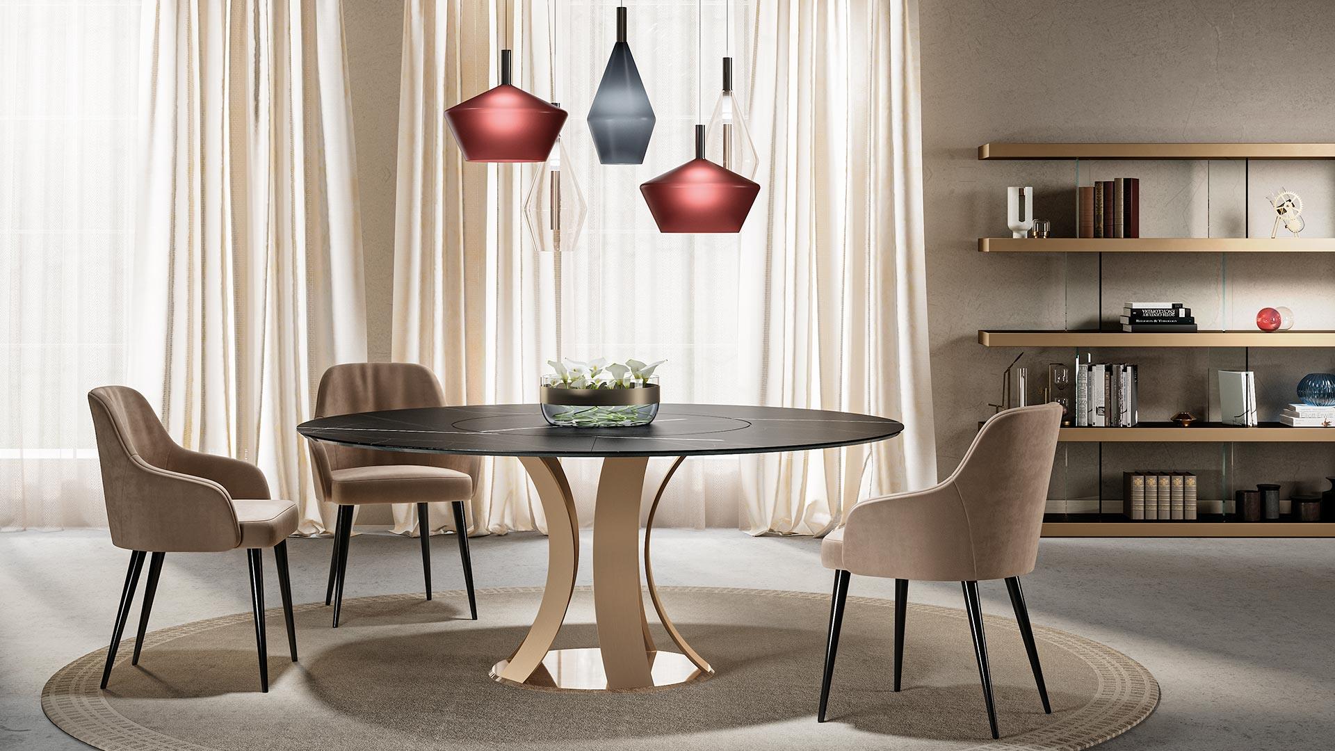 Dining table with base composed by curved legs and bottom disc in extra clear with Bronze or SunbronzeTop with built-in Lazy Susan in Marble glass 4+10mm thick, Wing edge.