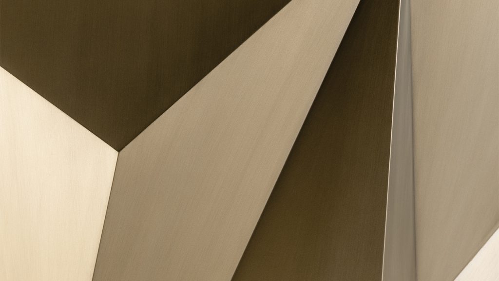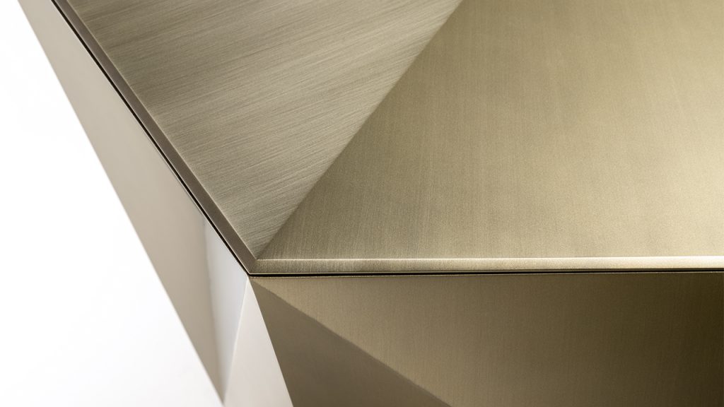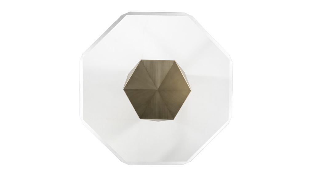 Piano in vetro trasparente, vetro extra-chiaro, Marmoreflex/Legnoreflex, vetro extrachiaro trasparente sp.15mm con bisello 35mm o in vetro sp.15mm con bisello 35mm verniciato Ottone Dark 105M.