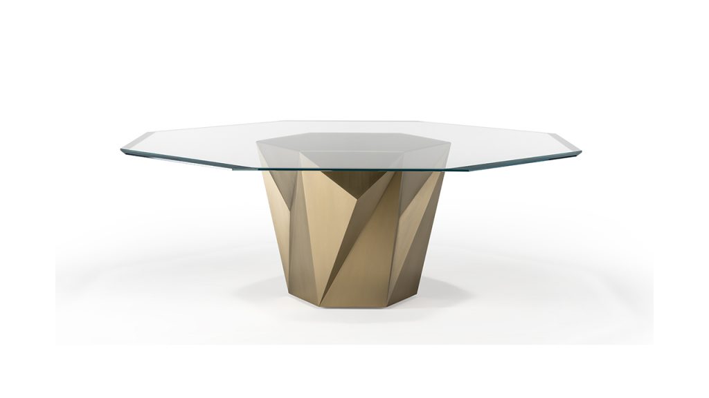 Tavolo pranzo con base in legno finitura Bronze (100M) o in finitura satinata ottone (104M), ottone dark (105M), titanium (101M), rame (107M), oro (103M). Base disponibile anche in Noce Canaletto, Canaletto Henné.