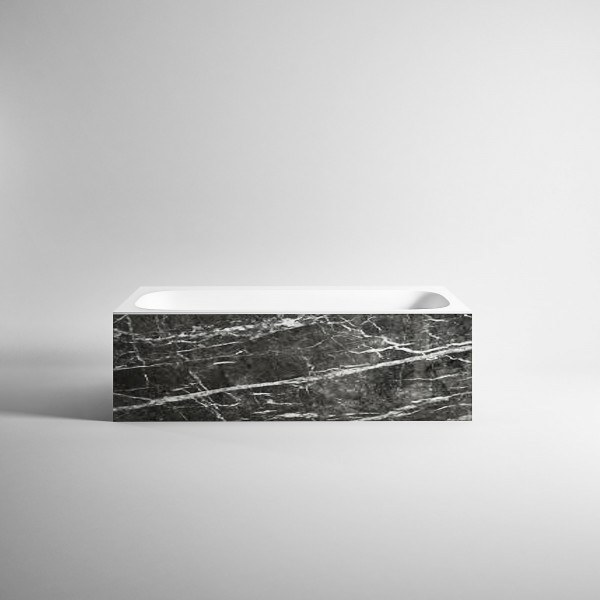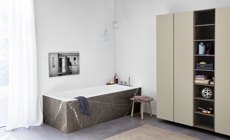 Wall cabinet with 45° cut doors and open element. Carcase and doors are in the same finish. The back of open elements is available in a light or dark decorative, otherwise it is available a paneling in matt lacquered, caly or Corian on demand.