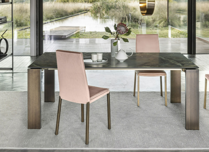 Il tavolo Atlante è interamente in legno, disponibile nelle finiture noce canaletto e rovere coke termo-trattato. Le gambe a cavalletto della larghezza di 17 cm gli conferiscono un aspetto maestoso. La bisellatura del piano mette in risalto le calde venature del legno. Il tavolo è dotato di un sistema di allunghe con guide in alluminio anodizzato. Le allunghe, da 40 cm, sono interne in biglia con il