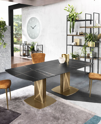 Il tavolo Atlante è interamente in legno, disponibile nelle finiture noce canaletto e rovere coke termo-trattato. Le gambe a cavalletto della larghezza di 17 cm gli conferiscono un aspetto maestoso. La bisellatura del piano mette in risalto le calde venature del legno. Il tavolo è dotato di un sistema di allunghe con guide in alluminio anodizzato. Le allunghe, da 40 cm, sono interne in biglia con il
