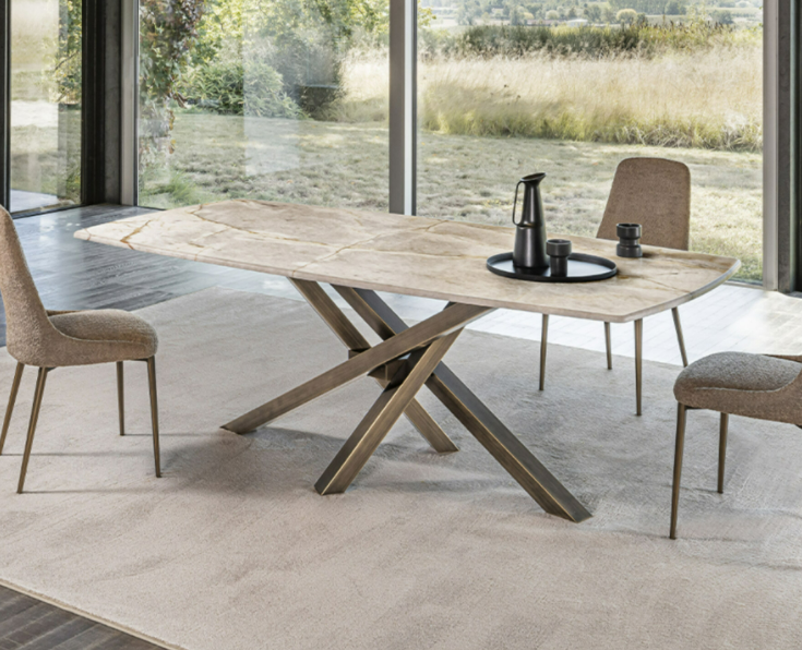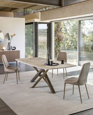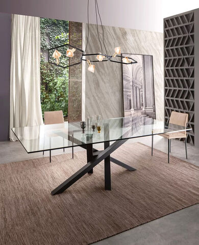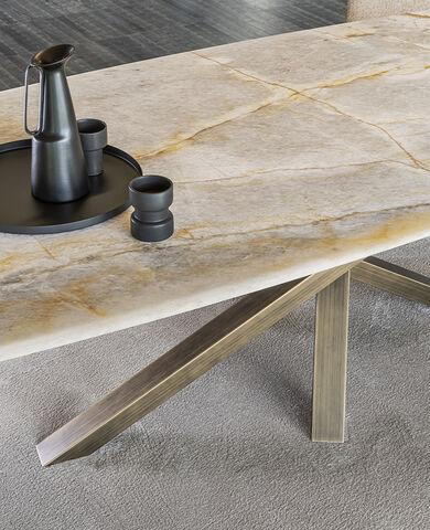 Il tavolo Atlante è interamente in legno, disponibile nelle finiture noce canaletto e rovere coke termo-trattato. Le gambe a cavalletto della larghezza di 17 cm gli conferiscono un aspetto maestoso. La bisellatura del piano mette in risalto le calde venature del legno. Il tavolo è dotato di un sistema di allunghe con guide in alluminio anodizzato. Le allunghe, da 40 cm, sono interne in biglia con il