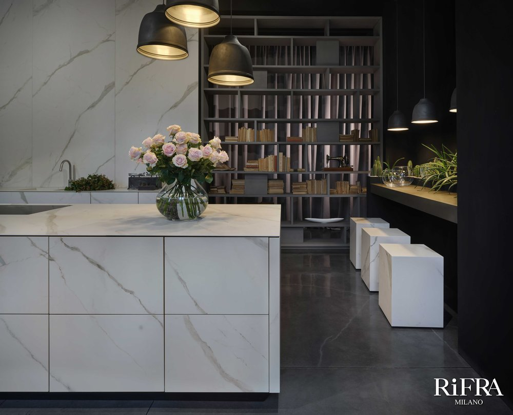 Finitura mobili isola e quinte: cemento nero spatolato a mano.