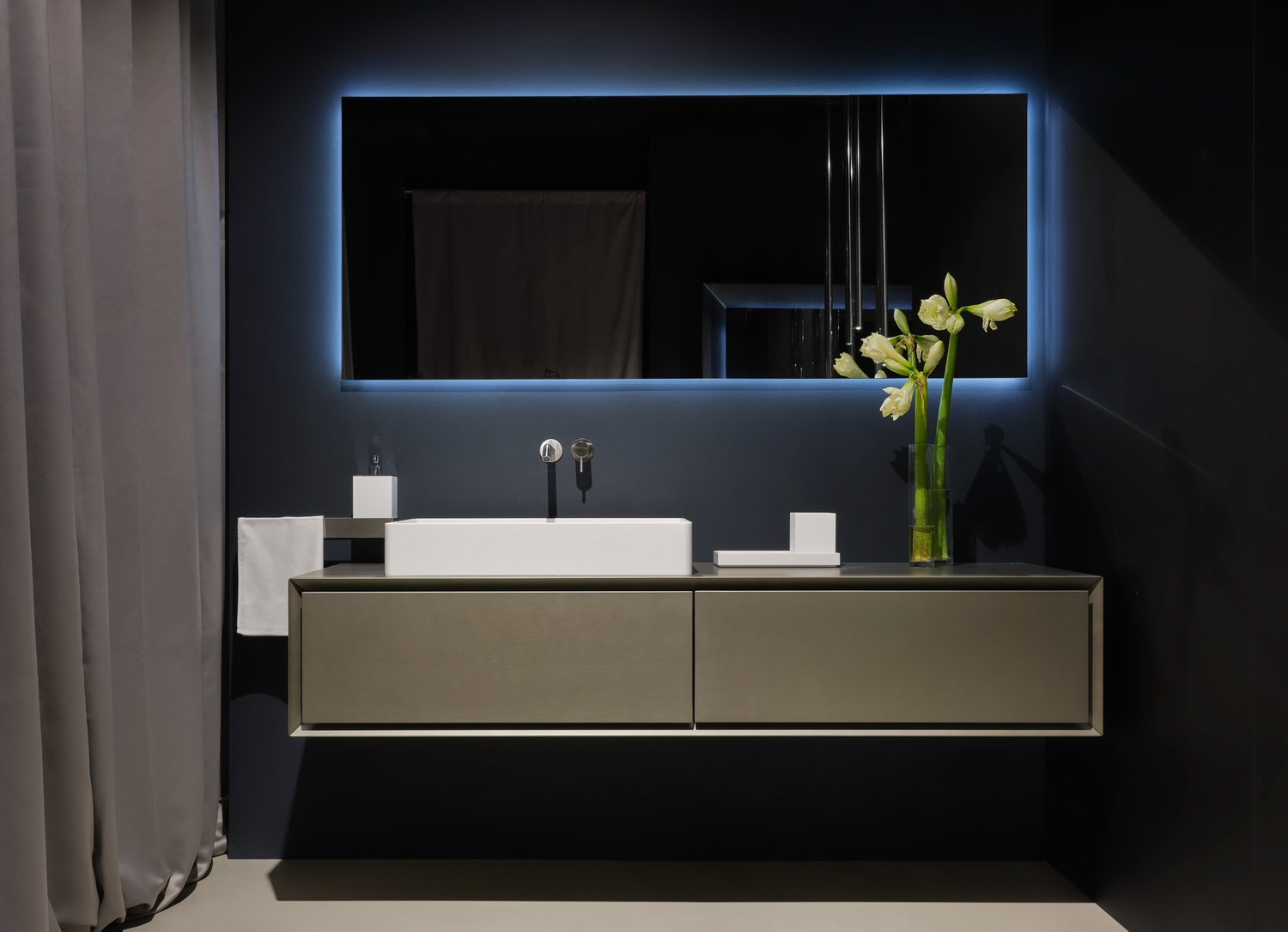Finitura mobili isola e quinte: cemento nero spatolato a mano.