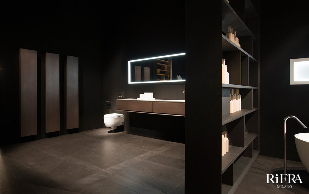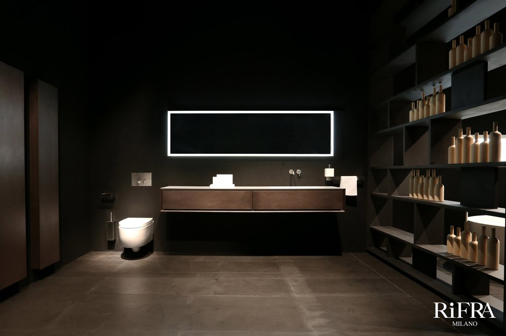 Finitura mobili isola e quinte: cemento nero spatolato a mano.
