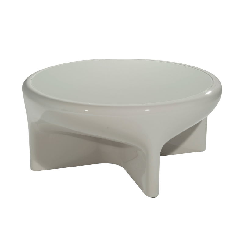 這款茶幾的設計特點形狀從一個十字形的底部逐漸過渡到一個圓柱形的頂部,看起來像火箭的尾部,材質為樹脂。