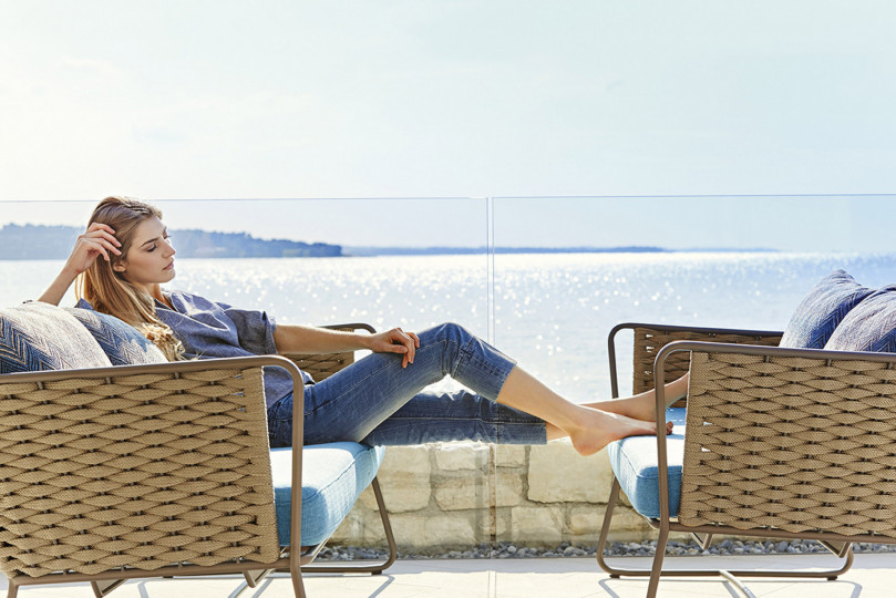 Divano in acciaio 304 verniciato a polveri, intrecciato con Flat Trendyrope. Un divano accogliente, dove la particolare geometria dello schienale si coniuga perfettamente al desiderio di comfort,  creando un angolo per vivere momenti di relax. Ottimo per arredare terrazzi e patio, dona forte personalità anche alle zone living interne. Ideale per arredamenti residenziali e contract.