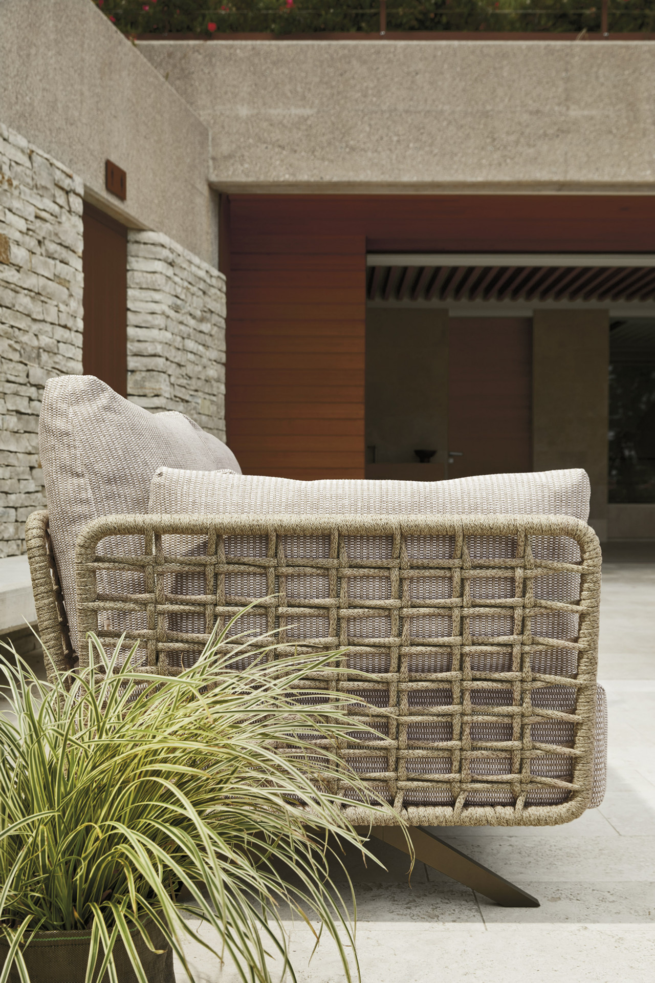 Bracciolo in acciaio inox Aisi 304 verniciato a polveri, intrecciato in Oval Trendyrope. Elemento componibile della linea Armàn, il cui intreccio in corda conferisce un tocco di artigianale raffinatezza ai divani, alle poltrone, alle chaise longue e daybed che compongono la collezione. Un dettaglio che costituisce non solo un elemento visivamente affascinante, ma offre anche un comfort ergonomico e un sostegno accogliente.