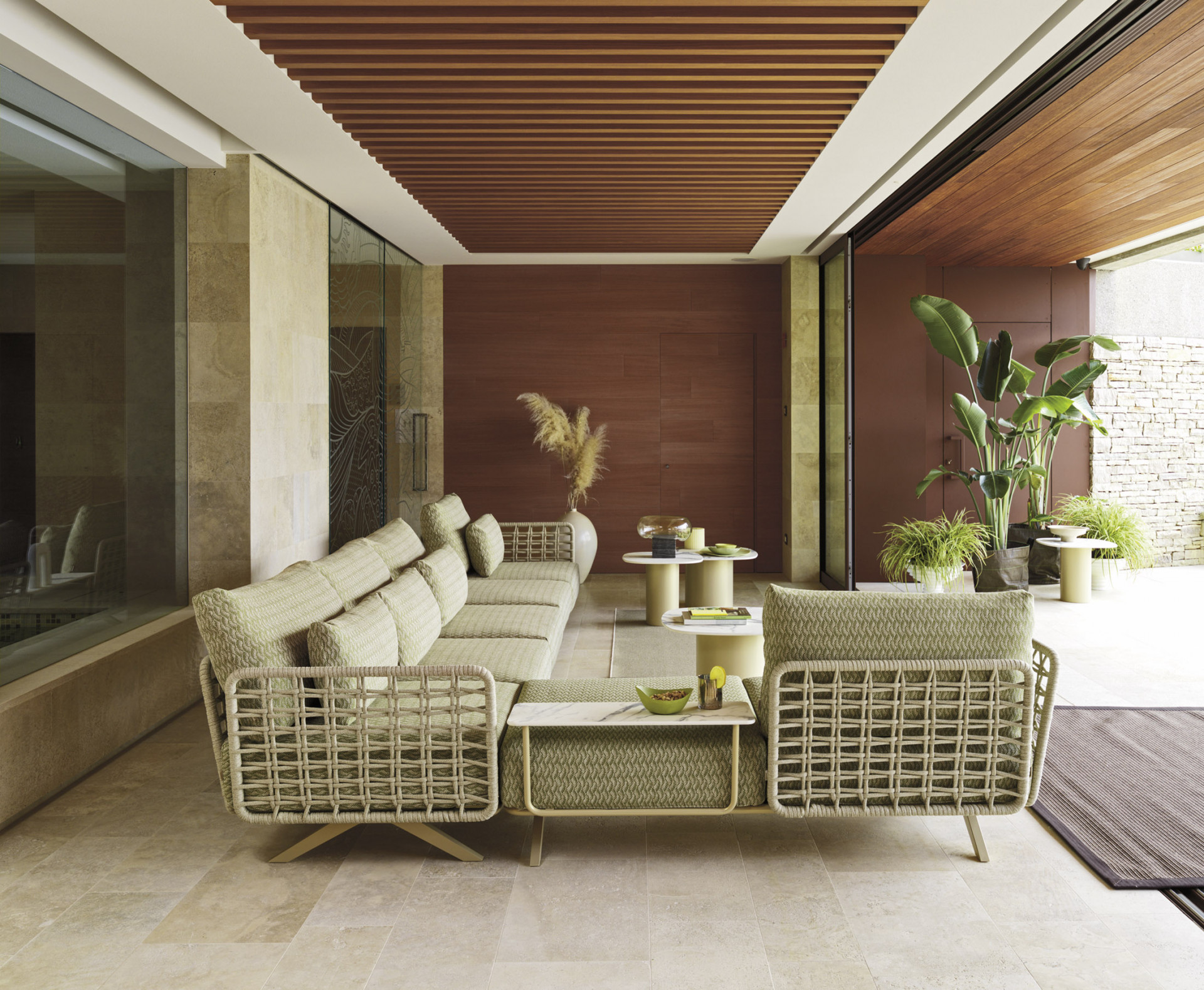 Schienale in acciaio inox Aisi 304 verniciato a polveri, intrecciato in Oval Trendyrope. Elemento componibile della linea Armàn, il cui intreccio in corda conferisce un tocco di artigianale raffinatezza ai divani, alle poltrone, alle chaise longue e daybed che compongono la collezione. Un dettaglio che costituisce non solo un elemento visivamente affascinante, ma offre anche un comfort ergonomico e un sostegno accogliente.