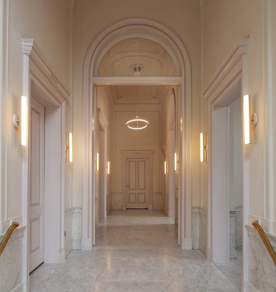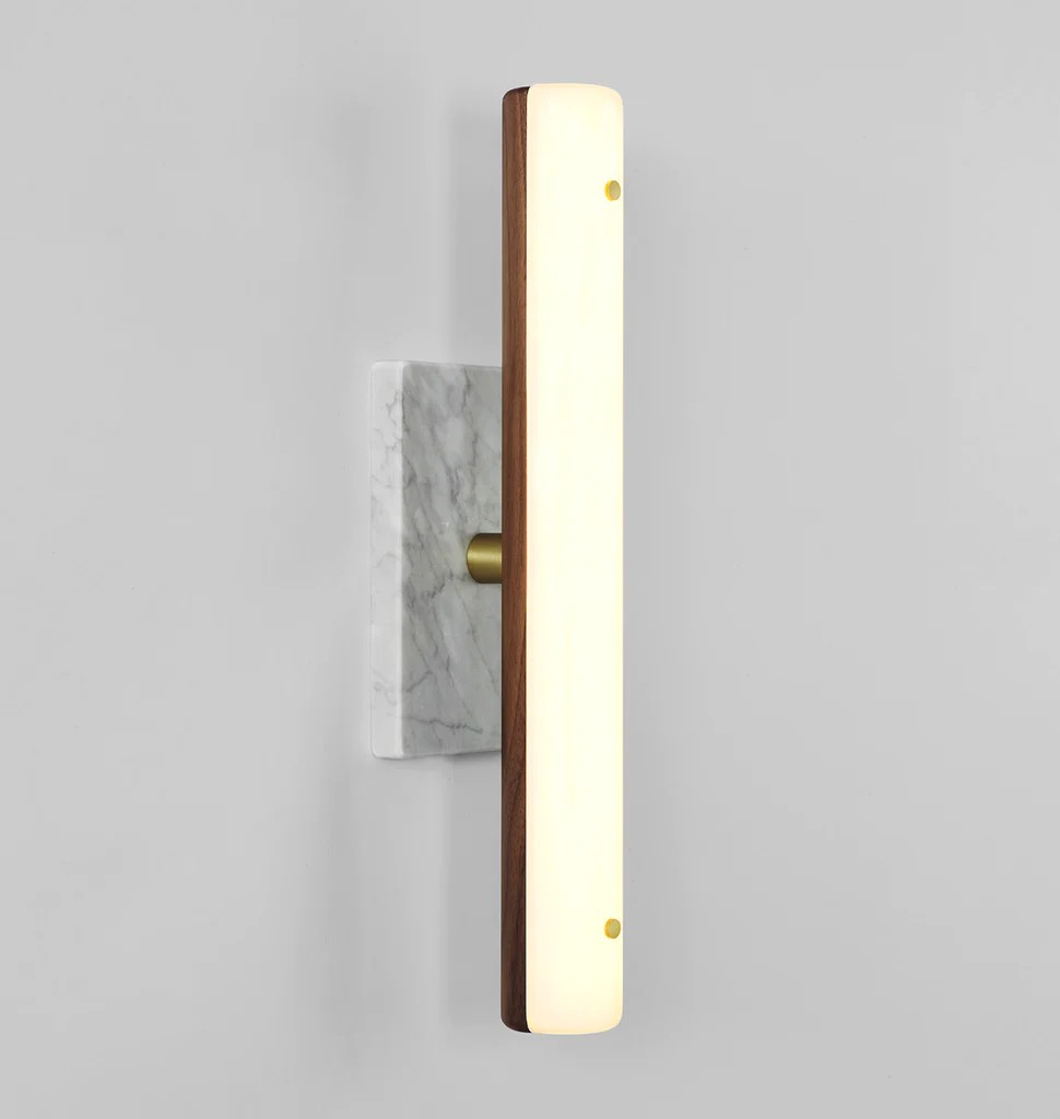 Counterweight  is a series of LED fixtures made of gently arching, steam-bent wood that uses marble and brass as ballasts. Whether acting to counterbalance the lamp of the pendant light, or fixed as the base of the sconce, the mass of the stone and metal acts as a foil to the otherwise lightweight frames.