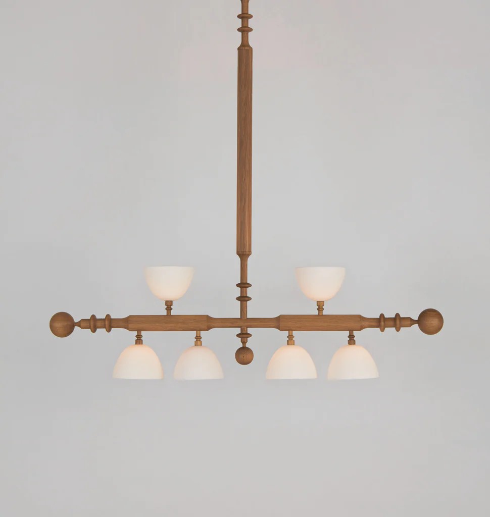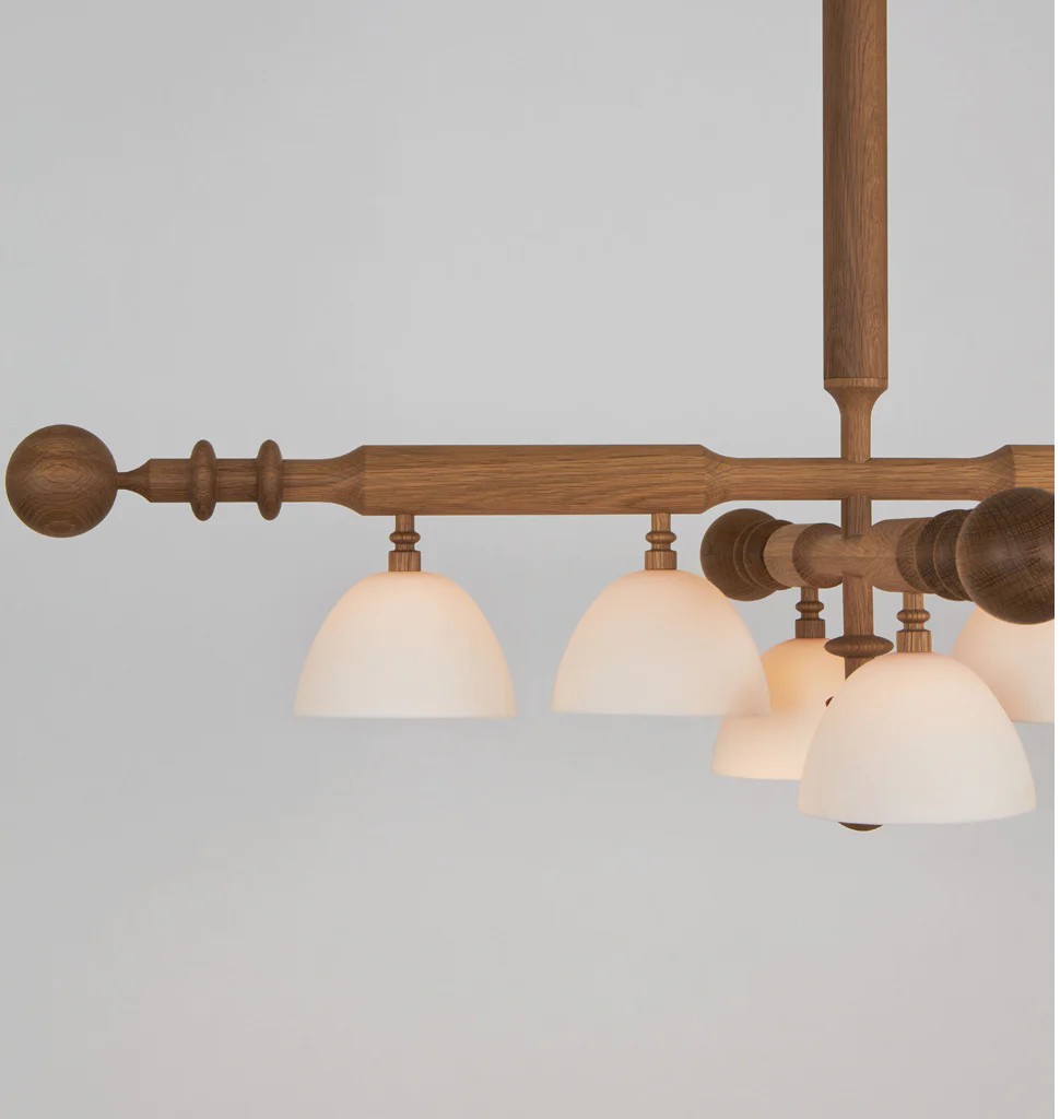 Helgerson's Del Playa is composed of turned wood stems and ceramic shades that recall her childhood on the beaches of Santa Barbara. The materials in this line feel very much of that time and place – the handcrafted aesthetic of California in the 70s.