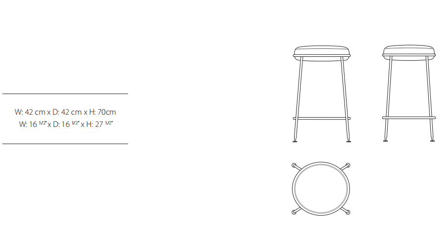 Stool frame made of solid timber and plywood. Variable densities polyurethane foam padding. Metal ring and feet in distressed finish.