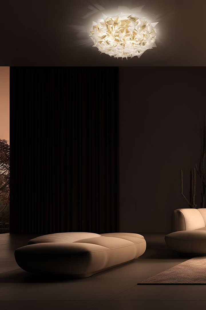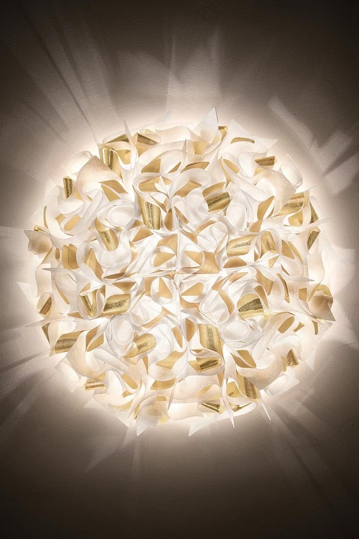 Introducing "Veli Aurea", a new finishing touch to an iconic collection of lamps crafted from avantgarde technopolymers, showcasing a white texture and golden lamina accents. Illuminate your space with the perfect blend of innovation and timeless design, and join the legacy of a modern and elegant masterpiece.