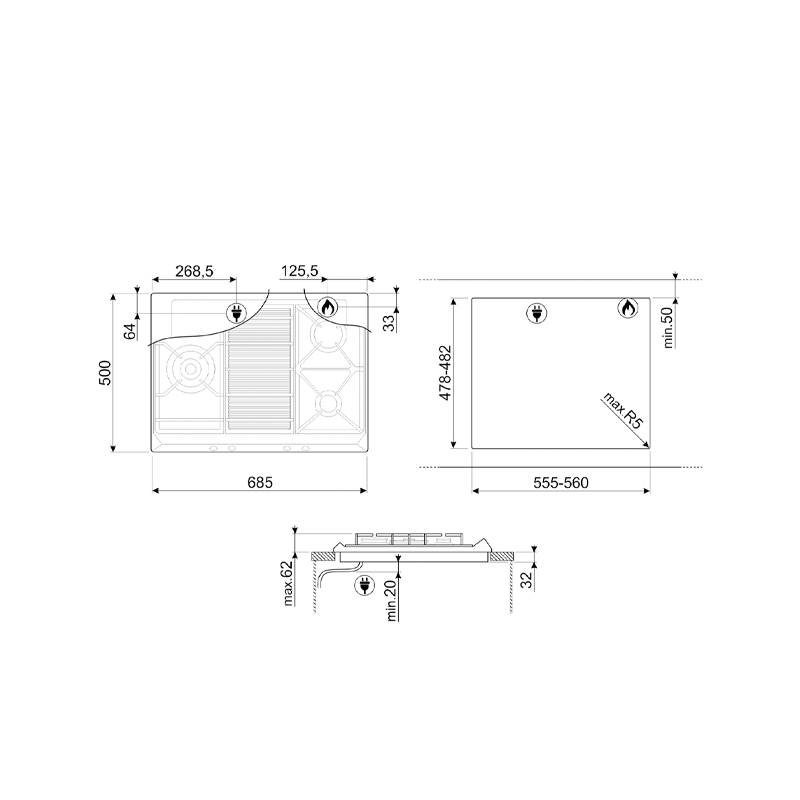 Classic/ 經典系列,70cm 嵌入式 3 眼燃氣灶具,1 級能效,拉絲不銹鋼,鑄鐵鍋架,全銅爐頭組件
