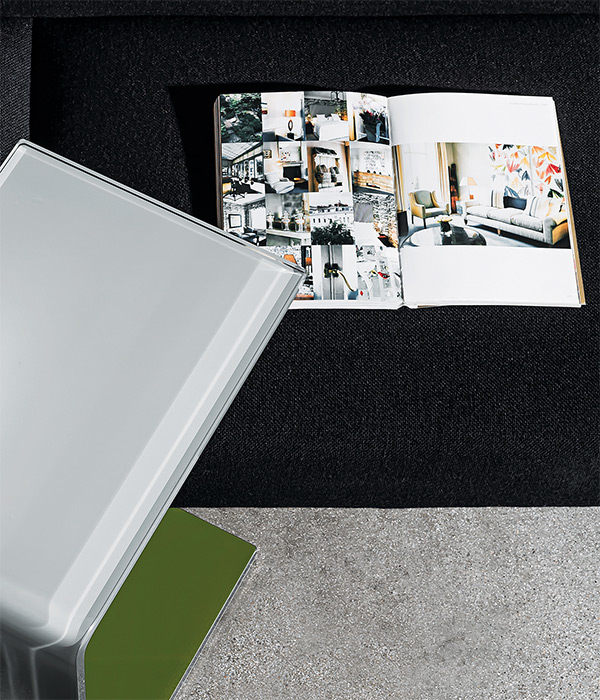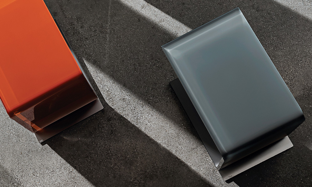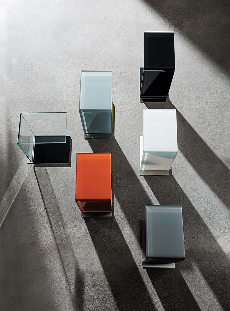 Tavolino in vetro curvo laccato o acidato laccato mono o bicolore. Piastra incollata in inox satinato.