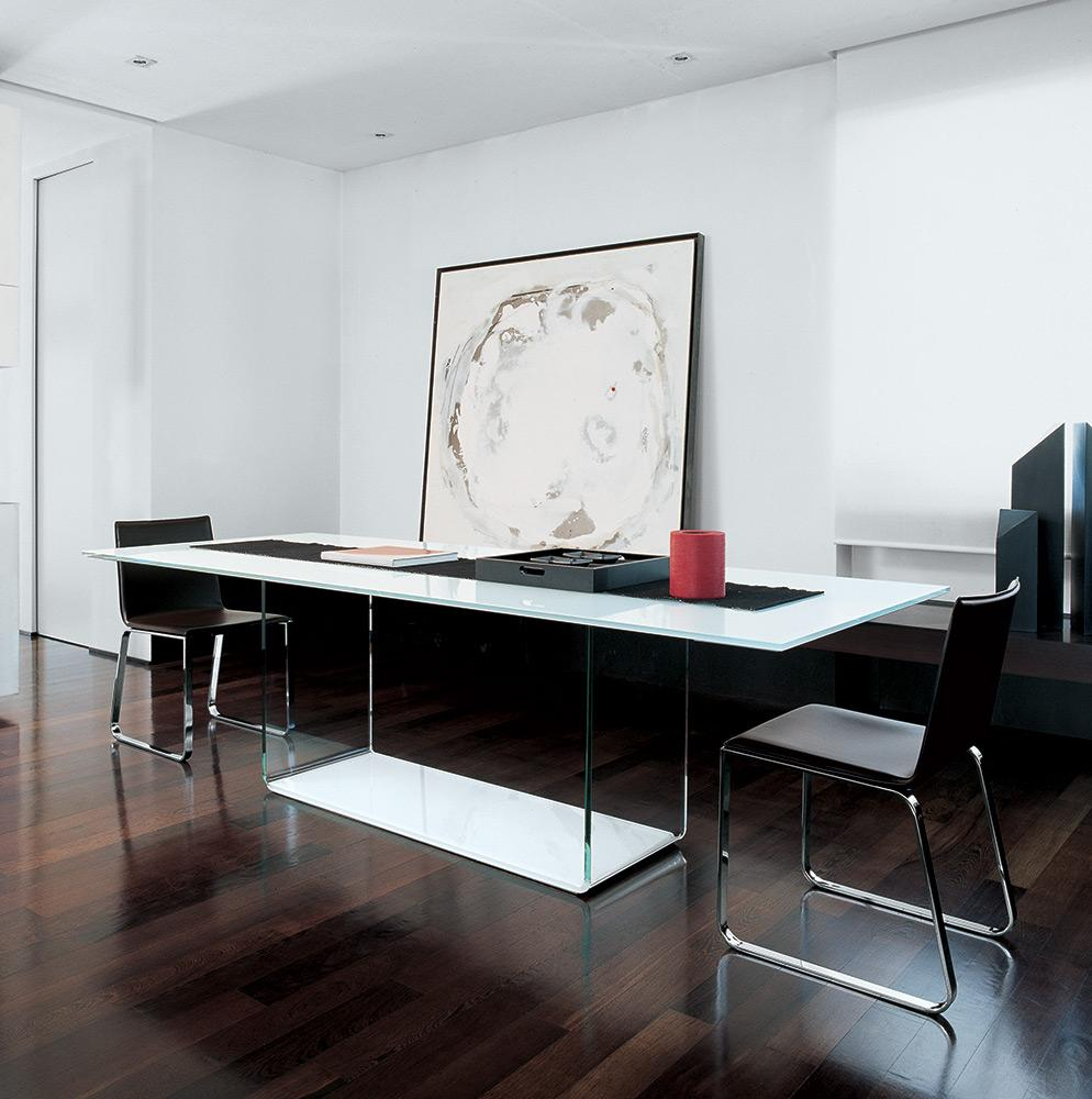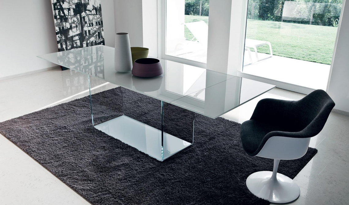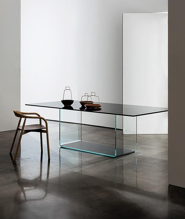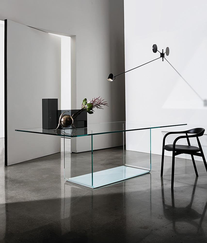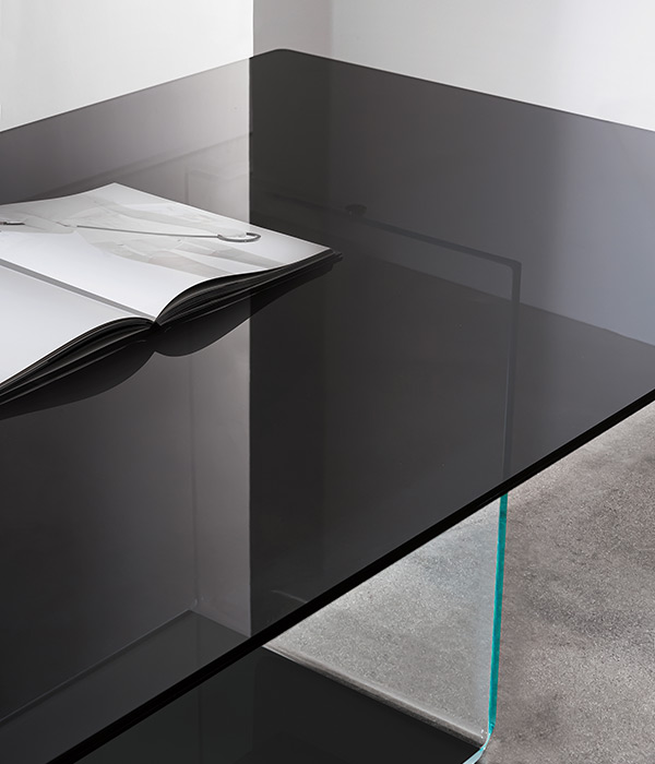 Tavolo con base in vetro curvo trasparente extrachiaro con parte a terra laccata, varie finiture. Top disponibile in vetro temperato o in legno, varie finiture