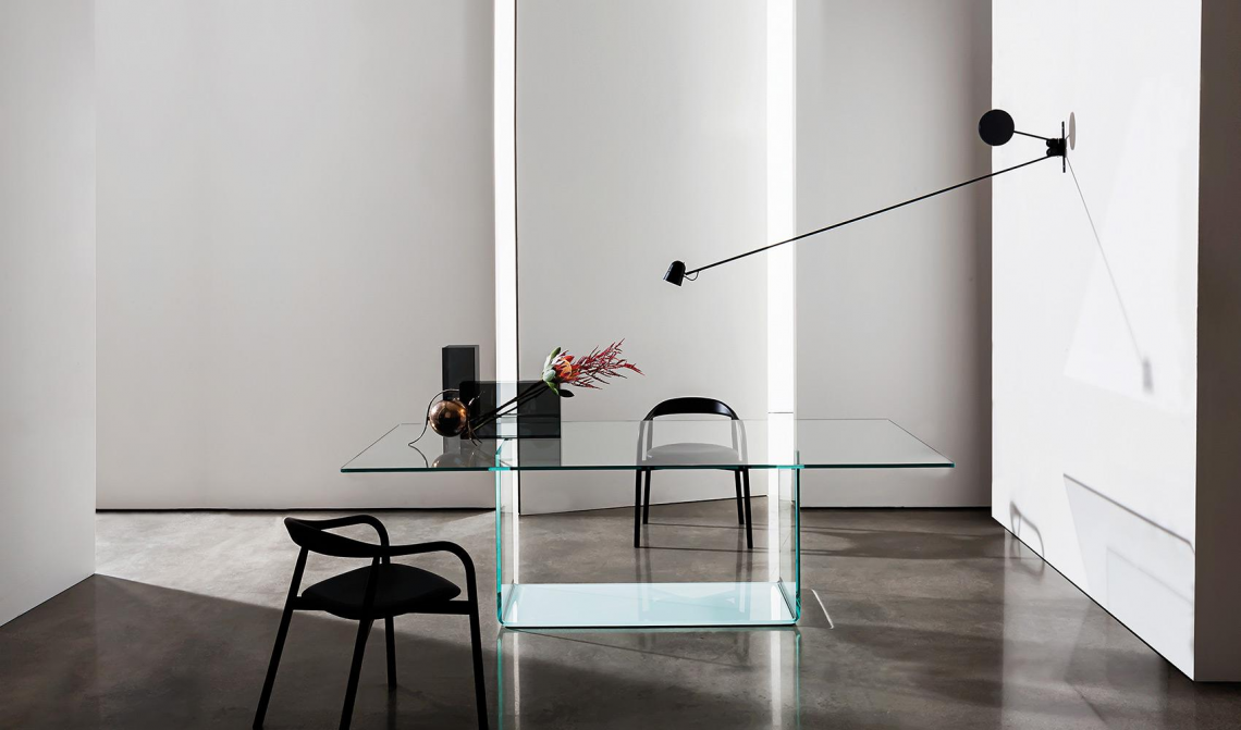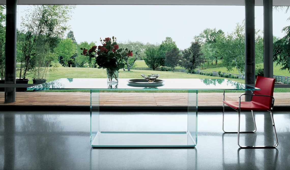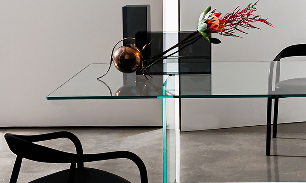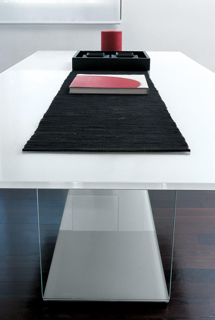 Tavolo con base in vetro curvo trasparente extrachiaro con parte a terra laccata, varie finiture. Top disponibile in vetro temperato o in legno, varie finiture