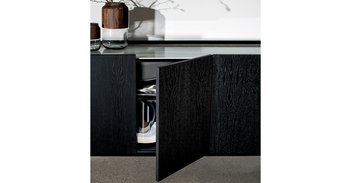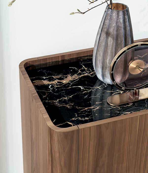 Una naturale evoluzione che completa la collezione. Gli spigoli arrotondati dei moduli in legno si fondono perfettamente con la struttura in alluminio. Le varie finiture del piano creano inedite soluzioni e contrasti.
