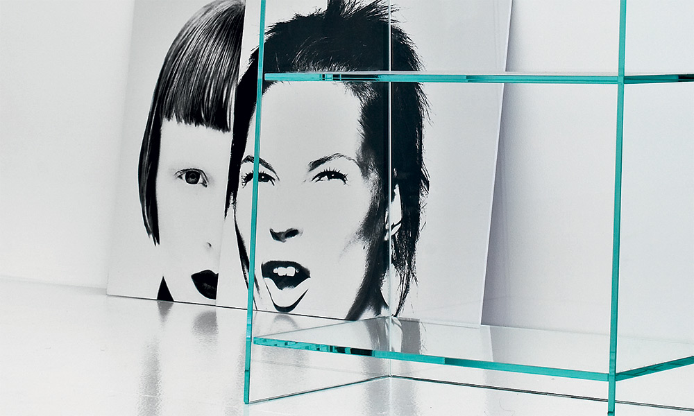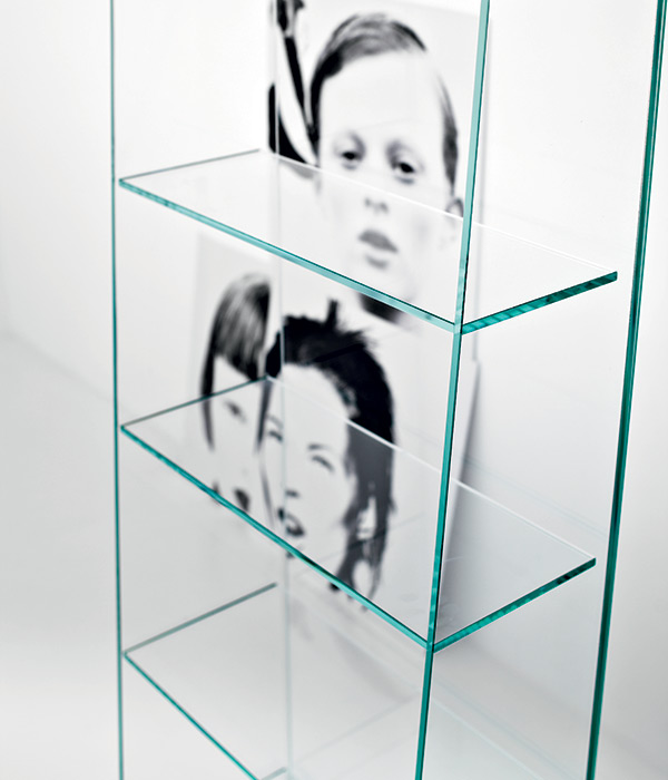 Espositore / libreria / porta cd in vetro incollato trasparente o trasparente extrachiaro.