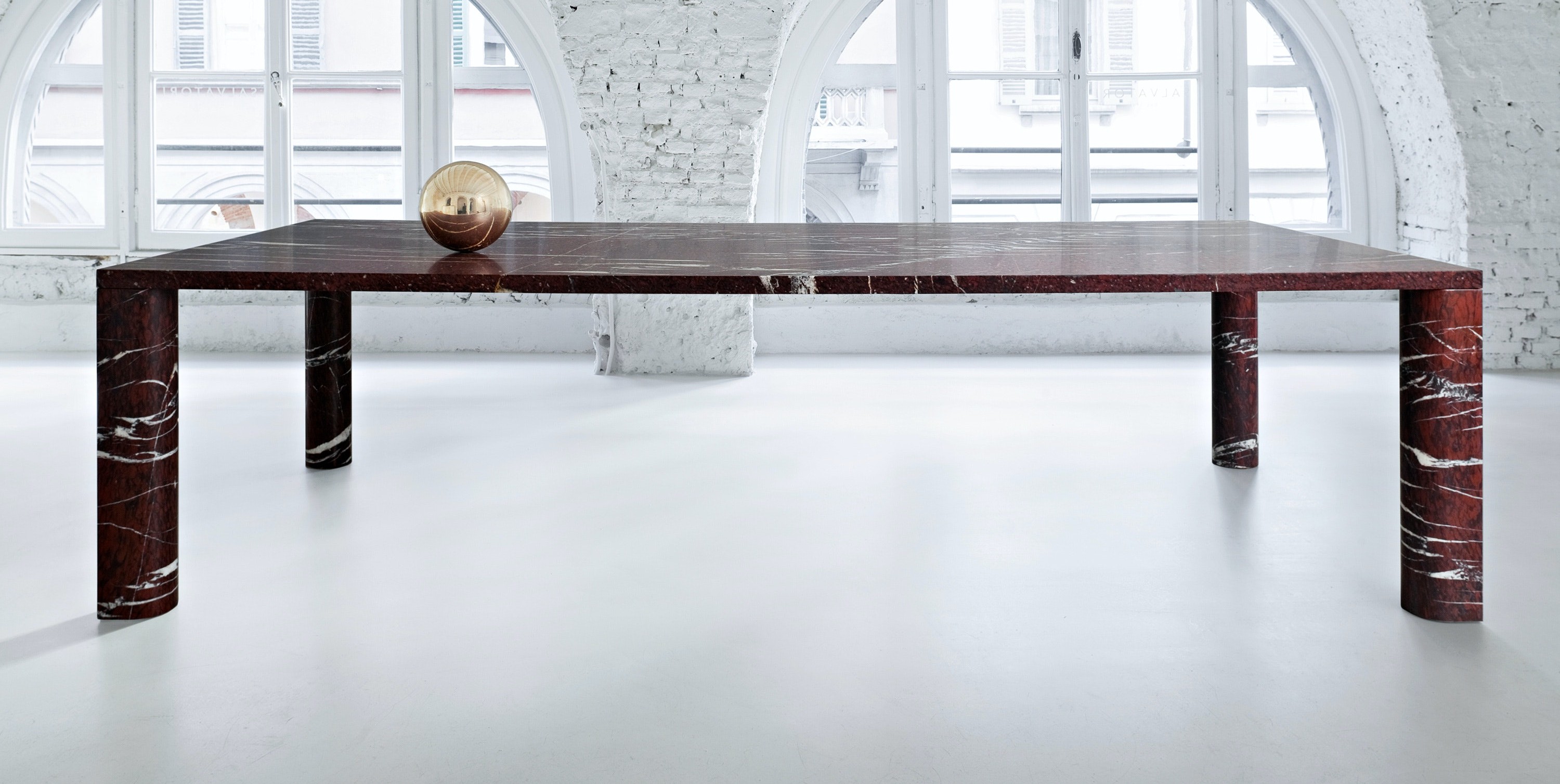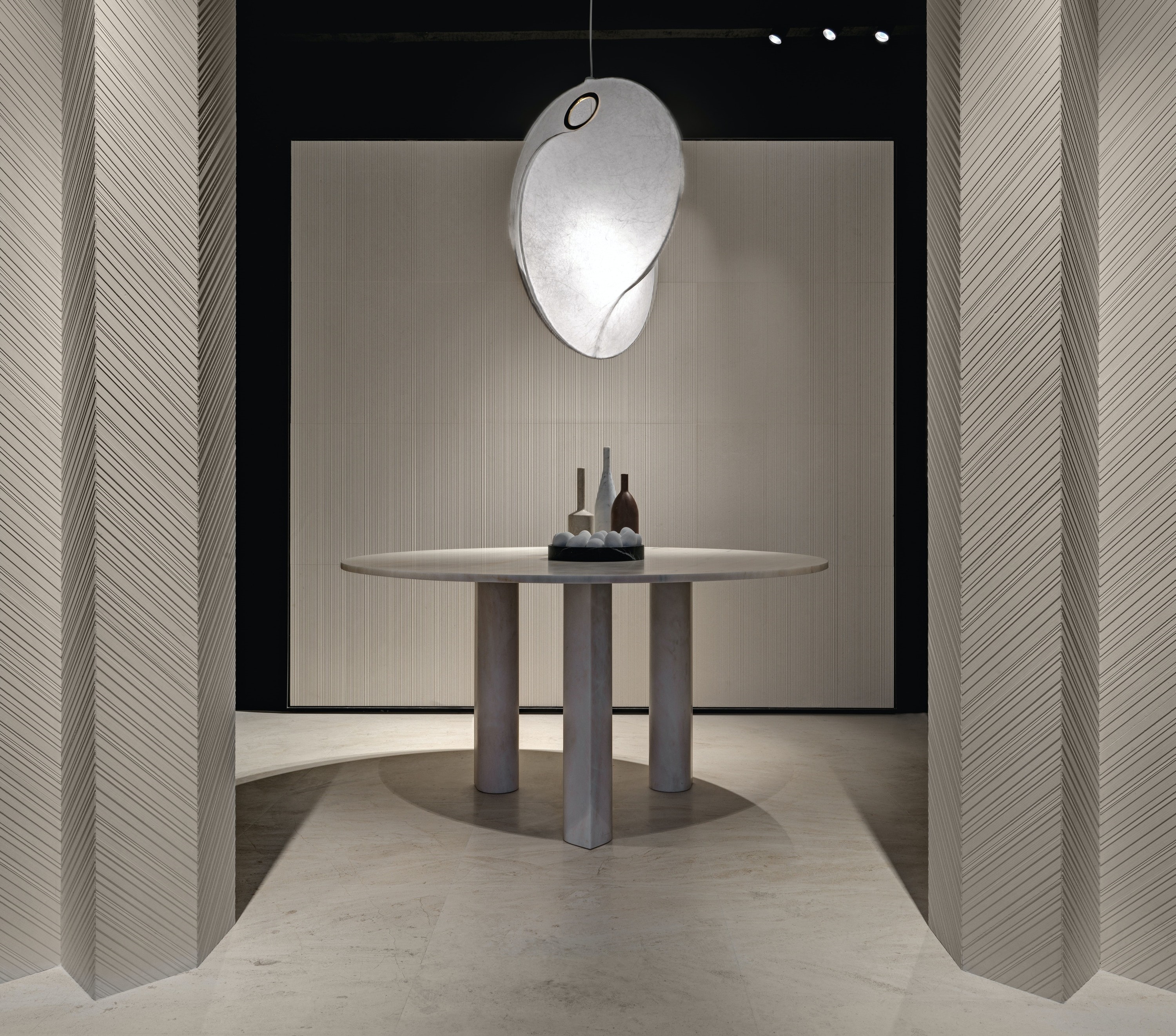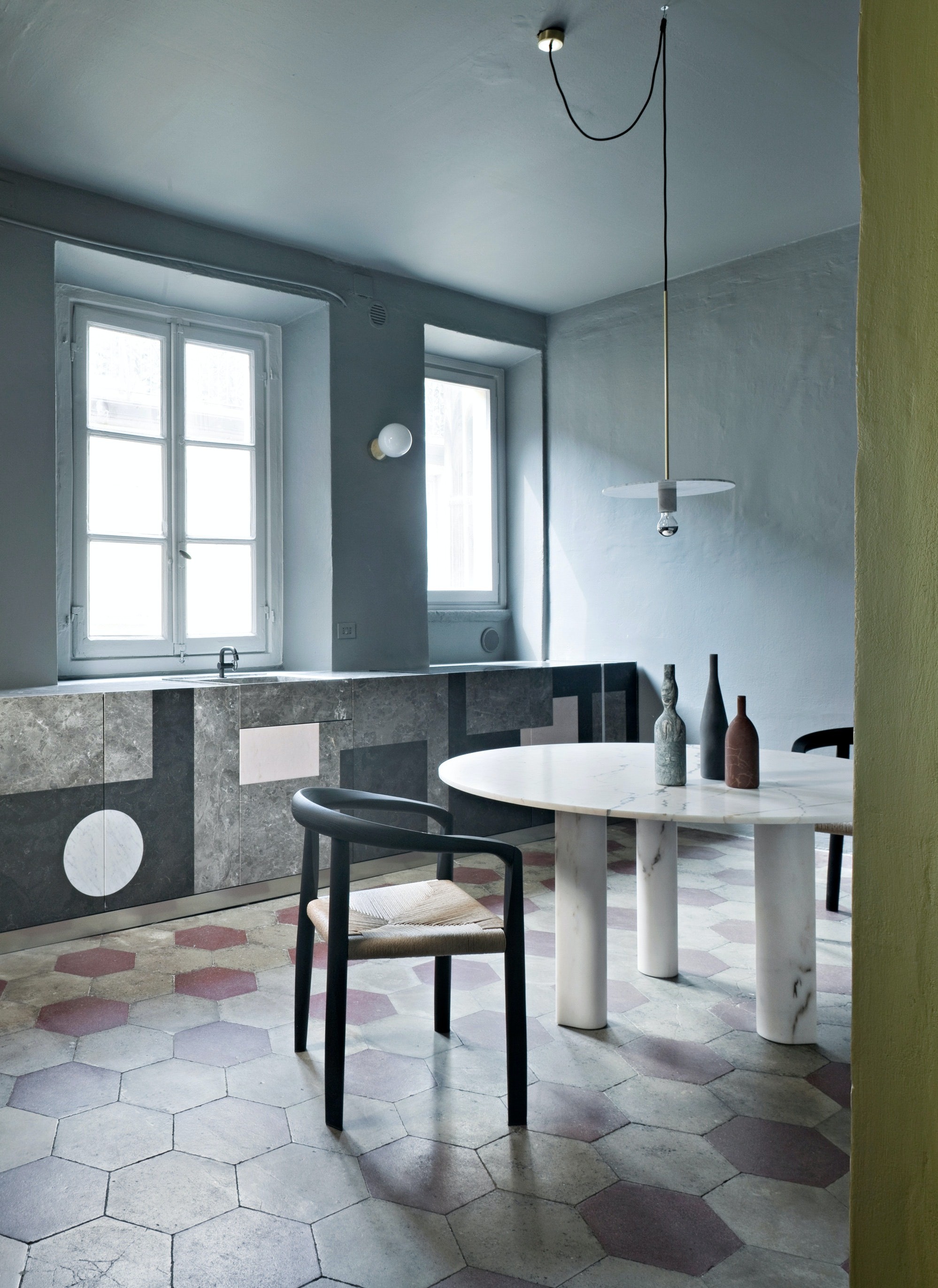 Instead of the highly polished look often associated with marble, the designer chose a matte finish so as to bring a more contemporary touch to the stone, highlighting their specific qualities through this subdued process.