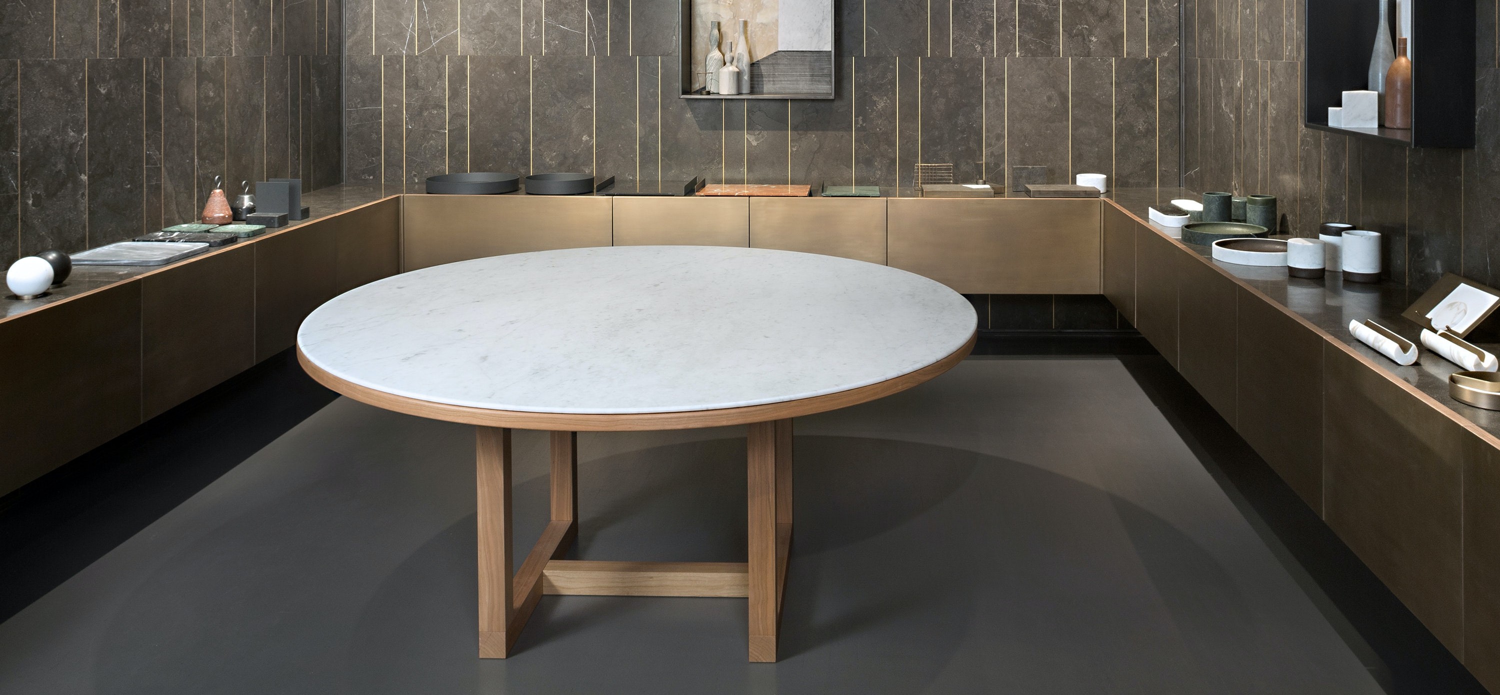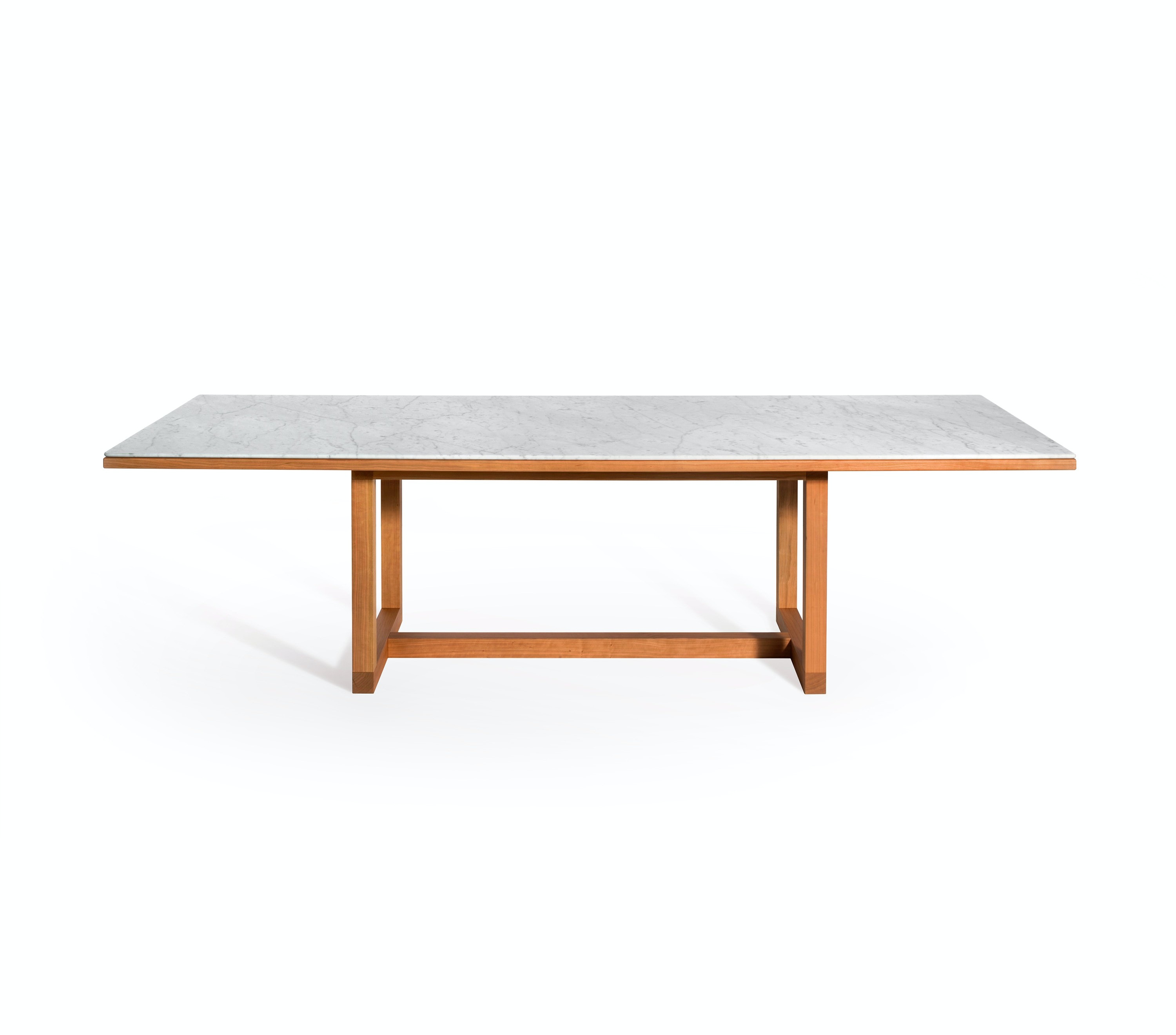 Available in rectangular and circular versions, each table pairs a beautiful piece of Bianco Carrara with a cherry wood structure and features careful details such as rounded edges and a simple but thoughtfully devised frame.