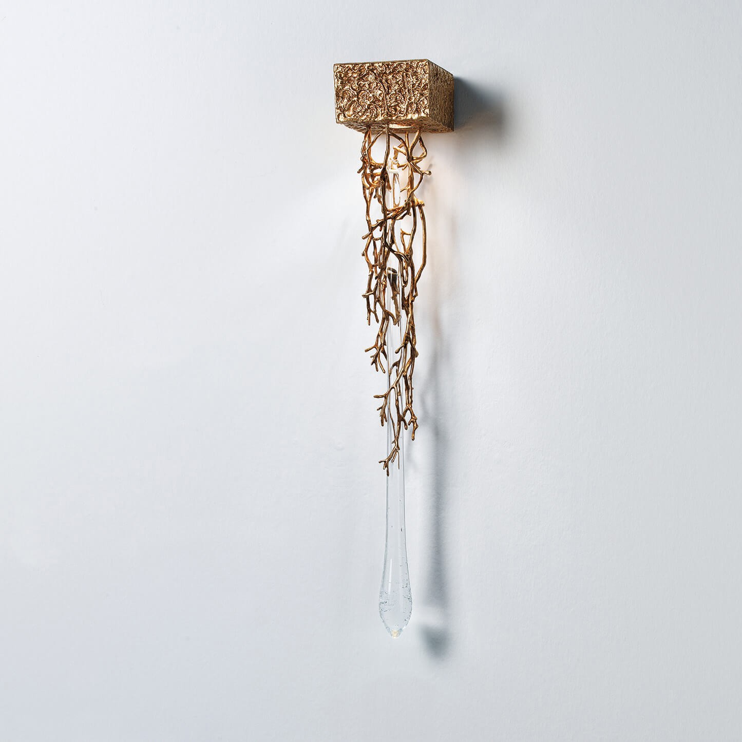 Pure and dazzling, the Liquid collection presents itself intentionally as a dense design. The vast branched pattern surrounds a considerable sized glass piece just as an embrace of nature, where the movement of the structure tries to reach the fall of a drop of water. Due to the steel cable solution, the Liquid collection is ideal for situations that require some structure and magnificence, achieving a status of lighting sculpture.