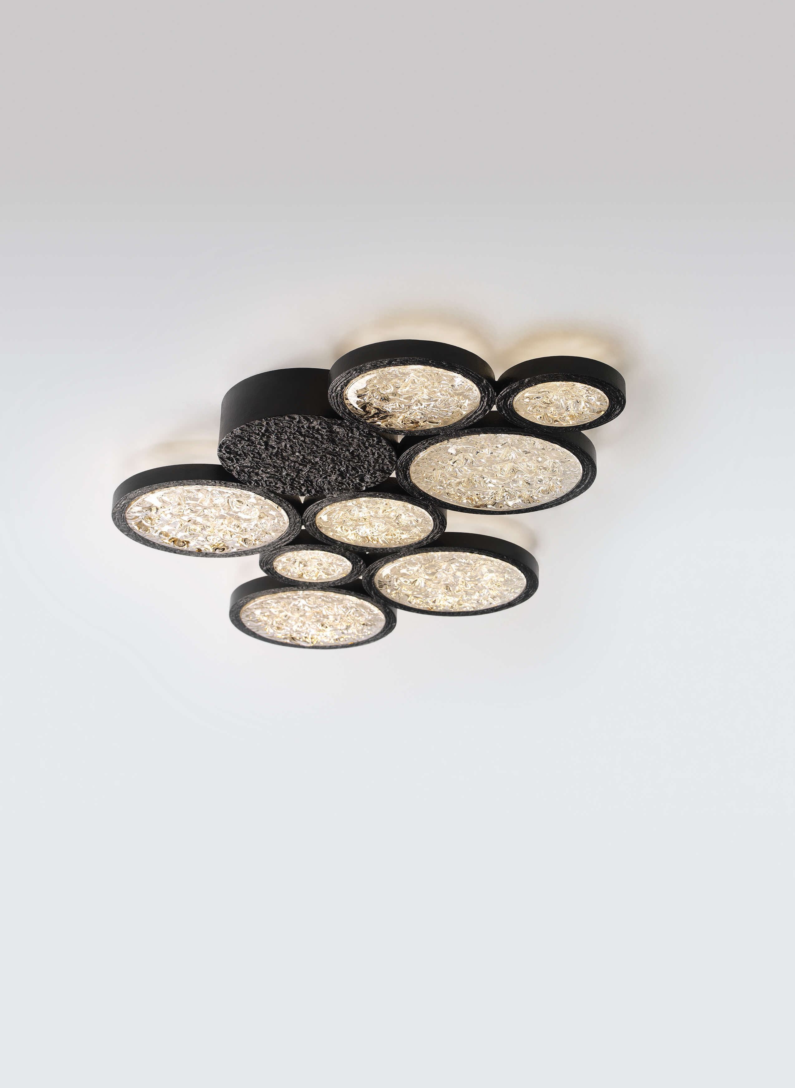 By the full moon contrasting light arises the Luna Collection, modern compositions with multiple rings of diffuse lighting. Designed under a mystical criteria of patterns, the circular pieces assume a position of high contrast and revolving texture, details that incorporate them as distinctive and eccentric, a bold choice in an interior design concept.