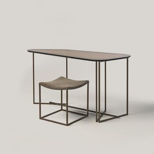 light bronze metal structure, wooden top in C80 resin lucida grigio sfumato seat in leather P20 nabuk liscio seppia