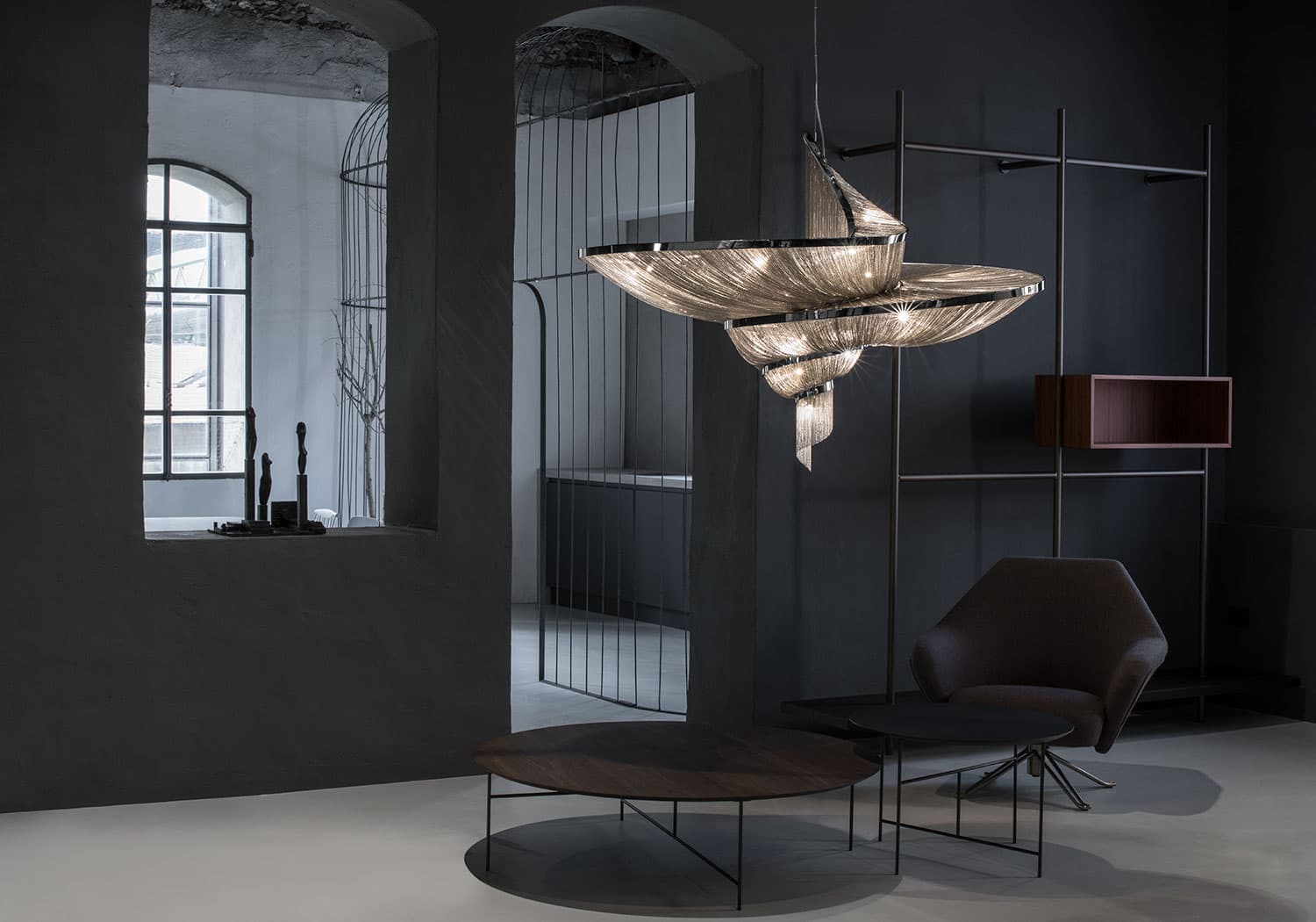 Epoque is a light sculpture designed to study chiaroscuro and volumes. The result is a modern expression of these Renaissanceera techniques in a stunning chandelier. Composed of curved, organic lines, Epoque’s frame is made of flexible and durable brass metal, suspended by nickel metal chains.