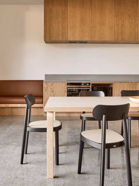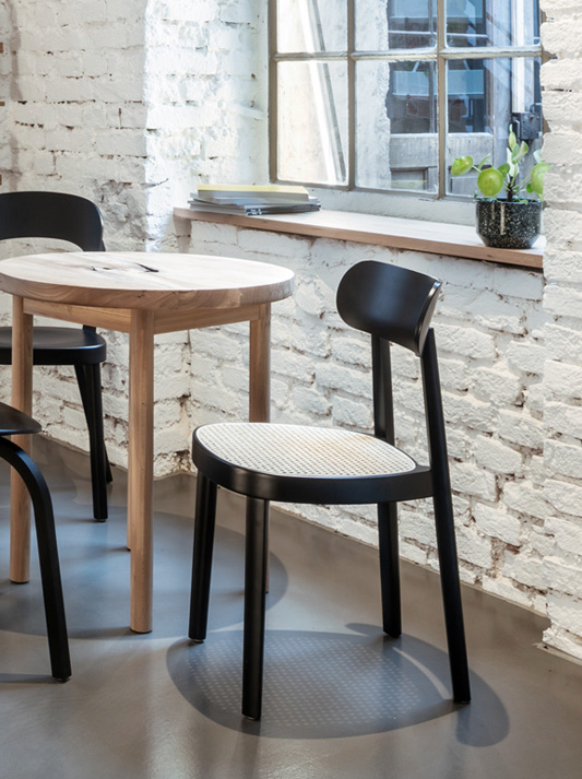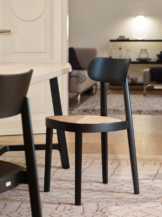 Minimalistic and honest, at the same time elegant and fine: the 118 chair is a classic wooden chair that adds subtle elegance to any dining table or restaurant. The principle of reducing a chair to the fewest elements possible was introduced by Michael Thonet in the mid-19th century. The 118 chair is a continuation of this principle and, with a nod to the company's heritage, it takes it one step further. Sebastian Herkner added sophisticated details, which make the design less dominant and therefore even more distinguished. The shape of the chair’s legs is another special feature: rounded on the outer side, straight on the inner side – a design that alludes to the horseshoe shape of the seating surface. The bent seat frame and the hand crafted seat covered with wickerwork refer to the original archetype of a Thonet chair, no. 214.