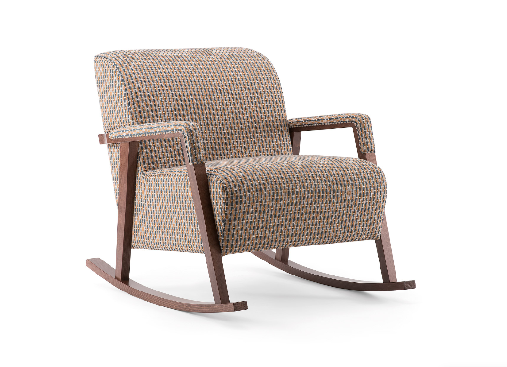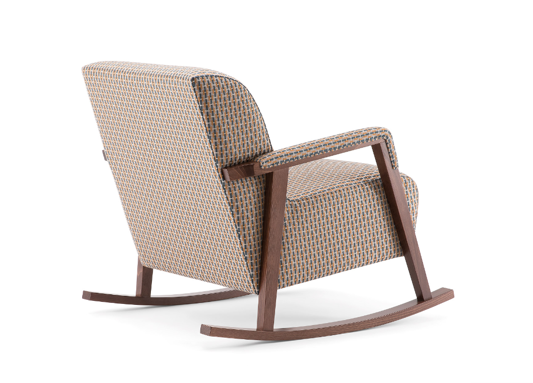 Seduta sorprendentemente accogliente, che riporta agli anni'70 in termini diforme e tessuti ma con un tocco di modernita. Poltrona a dondolo versatile efunzionale, realizzata in faggio, ottimale per arredi contract e navale.