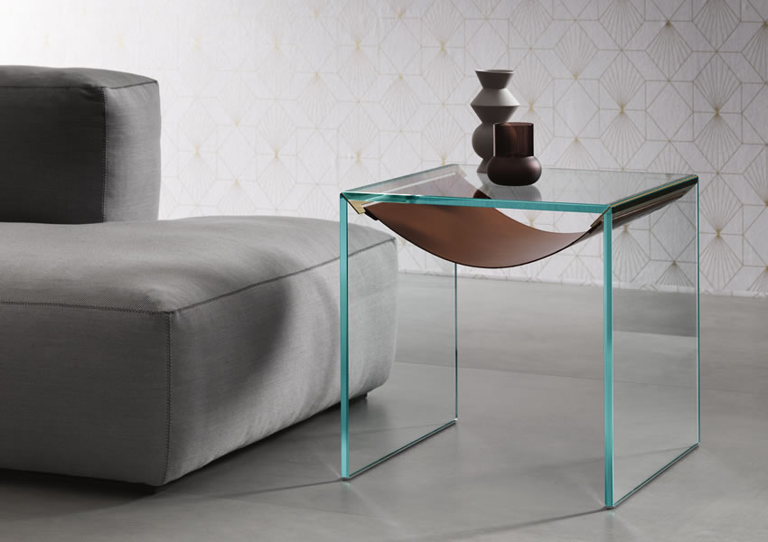 Furniture collection made of console, low table, side table or bed side table with frame in extra clear glass.
