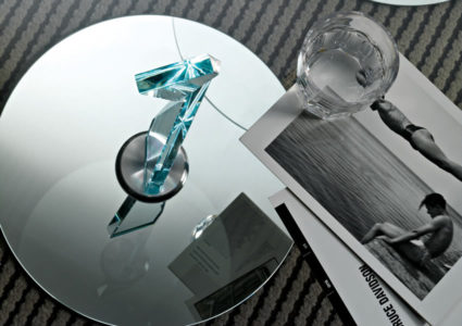 Multipurpose table, leg in thick glass with diamond grindings. Available in two heights, only extra clear glass.