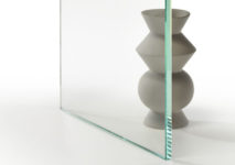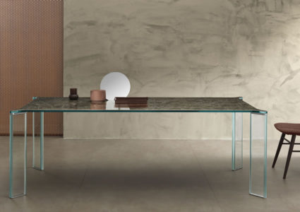Dining table in stratified glass or ceramic, where the legs define the table top’s form.
